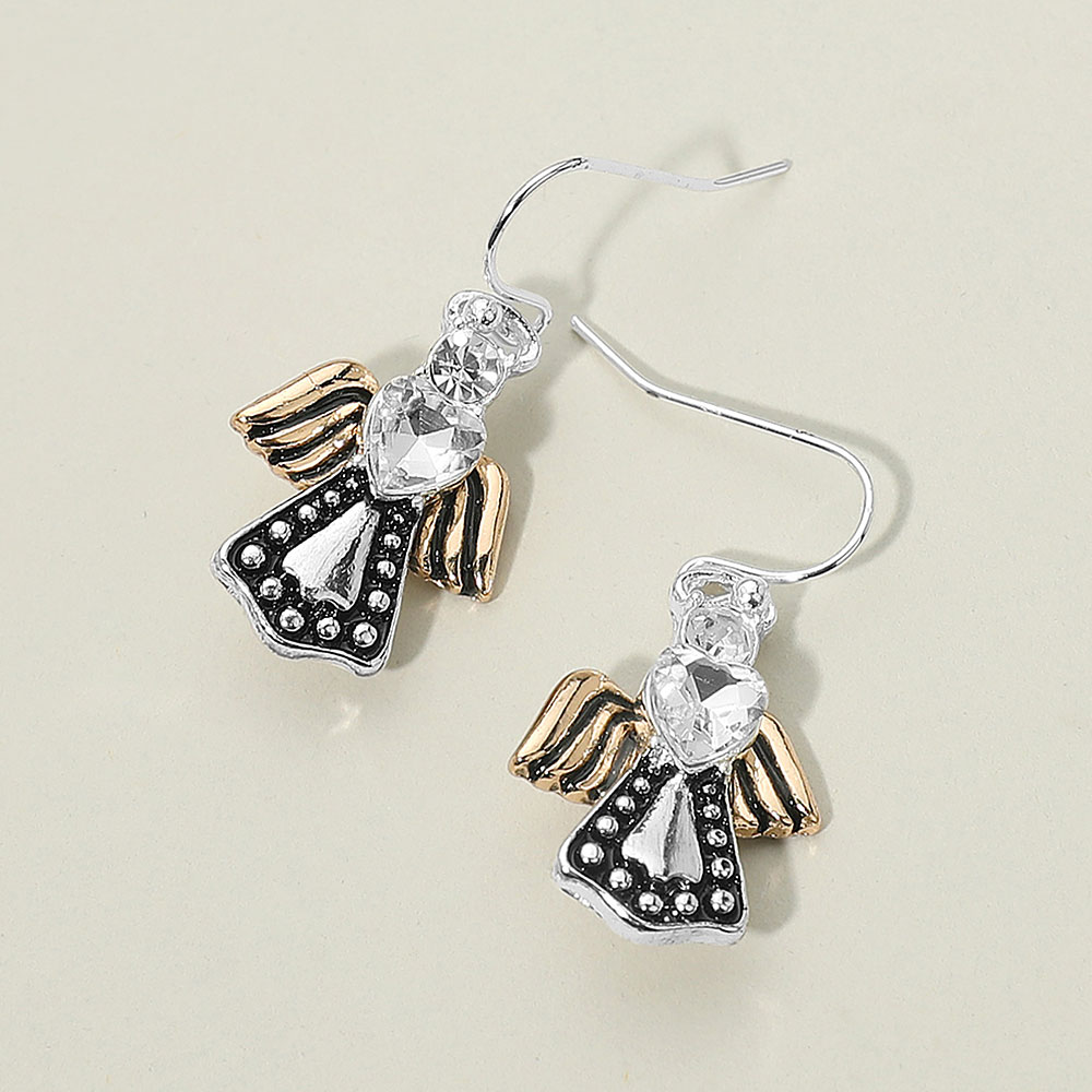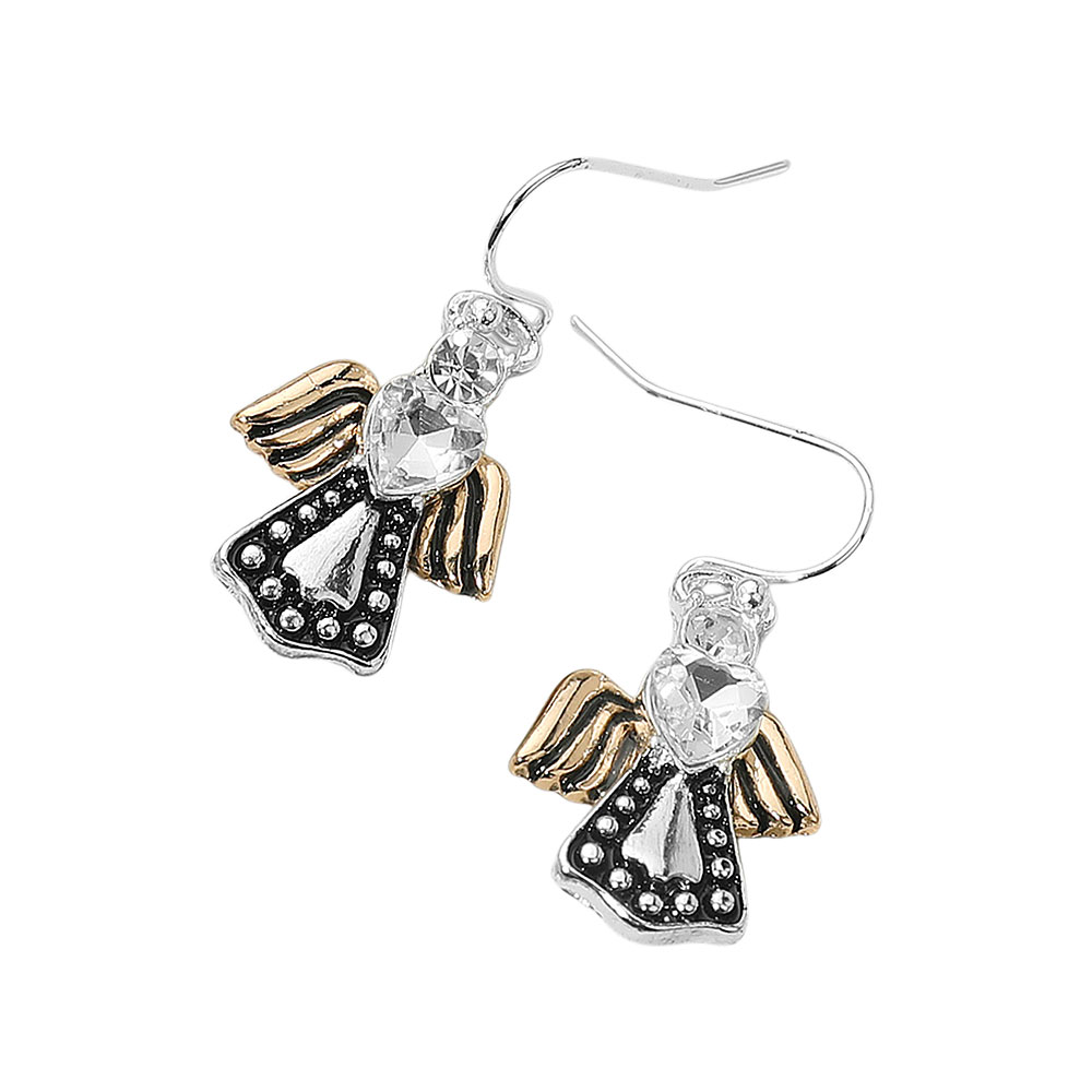 Details • Size : 0.7" X 1.25" • Fish Hook Back • Shine with grace and faith wearing these angel earrings, beautifully detailed with radiant crystal accents and golden wings. A meaningful symbol of protection and hope, they make a thoughtful gift and a stunning accessory for both everyday wear and special occasions. • Lead and Nickel Compliant