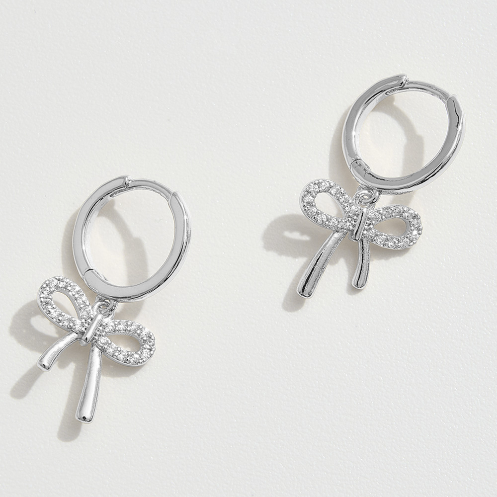 Details • Size : 0.5" X 0.9" • Huggie Back • These dainty hoop earrings feature sparkling CZ-studded bow charms that add a playful, feminine touch. Perfect for day-to-night wear, their chic design blends timeless elegance with whimsical detail, making them a versatile statement in any jewelry collection. • Brass • CZ Cubic Zirconia • Gold Dipped • Hypoallergenic • Lead and Nickel Compliant • Made In Korea