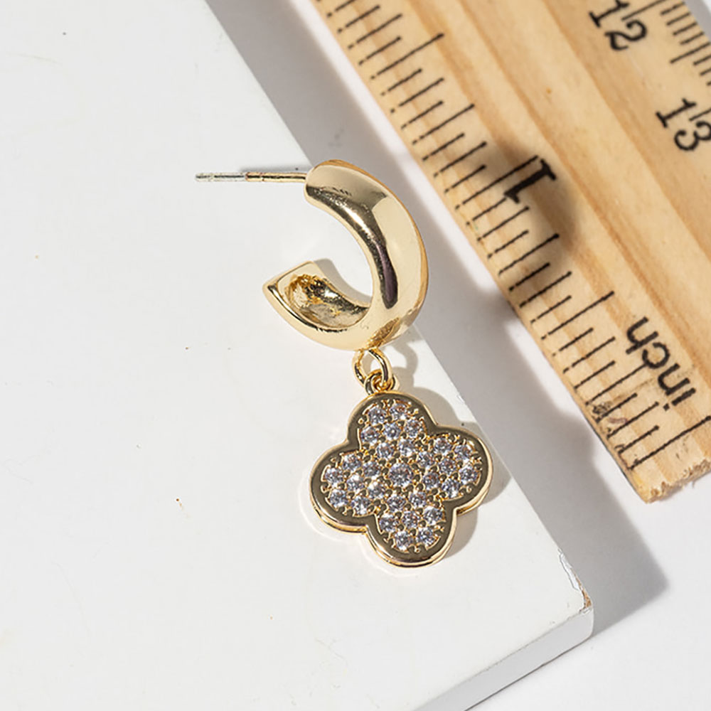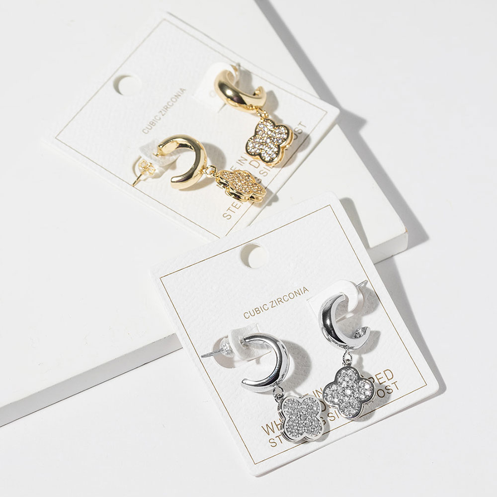 • Elegant crescent hoop earrings featuring a sparkling CZ quatrefoil charm that adds refined detail and soft movement. Designed to elevate everyday outfits or special looks, this timeless drop style offers a balanced blend of modern shape and classic charm, ideal for boutiques and curated accessory collections.
