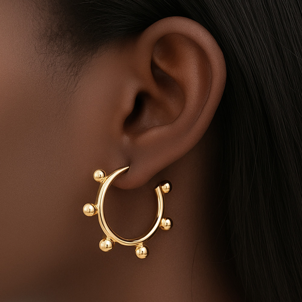 Details • Size : 1.25" X 1" • Post Back • Striking hoop earrings designed with polished ball details along the curve for a bold and contemporary edge. Perfect for elevating everyday outfits or making a stylish statement, these hoops balance modern geometry with timeless sophistication. • Brass • Gold Dipped • Hypoallergenic • Lead and Nickel Compliant • Made In Korea