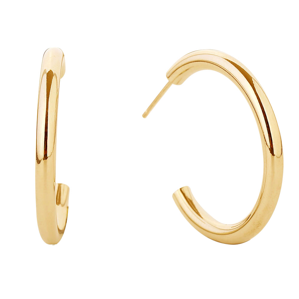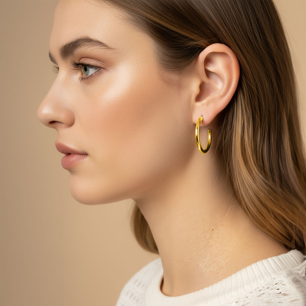 Details • Size : 1.2" X 1.2" • Post Back • Water resistant plating • Timeless medium hoop earrings designed with a smooth and modern finish. Lightweight and comfortable, they bring effortless style for daily wear or special occasions, making them a versatile jewelry essential for any wardrobe. • Brass • Gold Dipped • Hypoallergenic • Lead and Nickel Compliant • Made In Korea