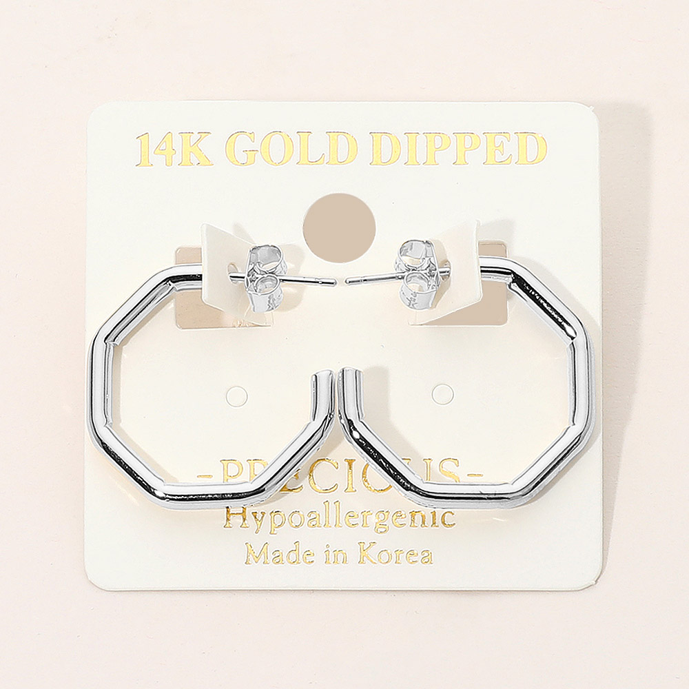 Details • Size : 1" X 1" • Post Back • Elevate everyday style with these geometric open hoop earrings featuring a sharp angular silhouette and clean modern outline. Lightweight and versatile, they transition seamlessly from daytime polish to evening edge, making them a go-to accessory for trend-focused wardrobes and minimalist looks. • Gold Dipped • Hypoallergenic • Made In Korea