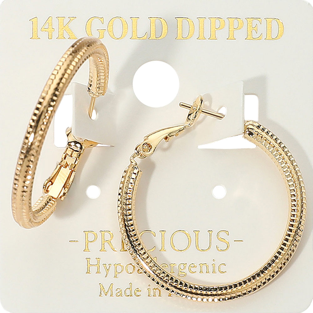 Details • Size : 1.25" X 1.25" X 0.2" • Omega Back • Refined and timeless, these hoop earrings feature a textured surface and polished finish that enhance any look with subtle sophistication. Their versatile style transitions effortlessly from casual to formal, making them a must-have addition to any jewelry collection. • Gold Dipped • Hypoallergenic • Made In Korea