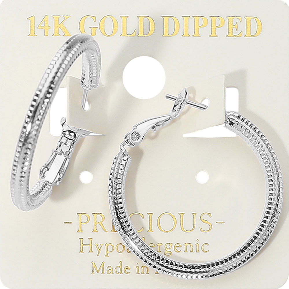 Details • Size : 1.25" X 1.25" X 0.2" • Omega Back • Refined and timeless, these hoop earrings feature a textured surface and polished finish that enhance any look with subtle sophistication. Their versatile style transitions effortlessly from casual to formal, making them a must-have addition to any jewelry collection. • Gold Dipped • Hypoallergenic • Made In Korea