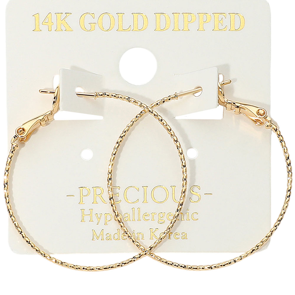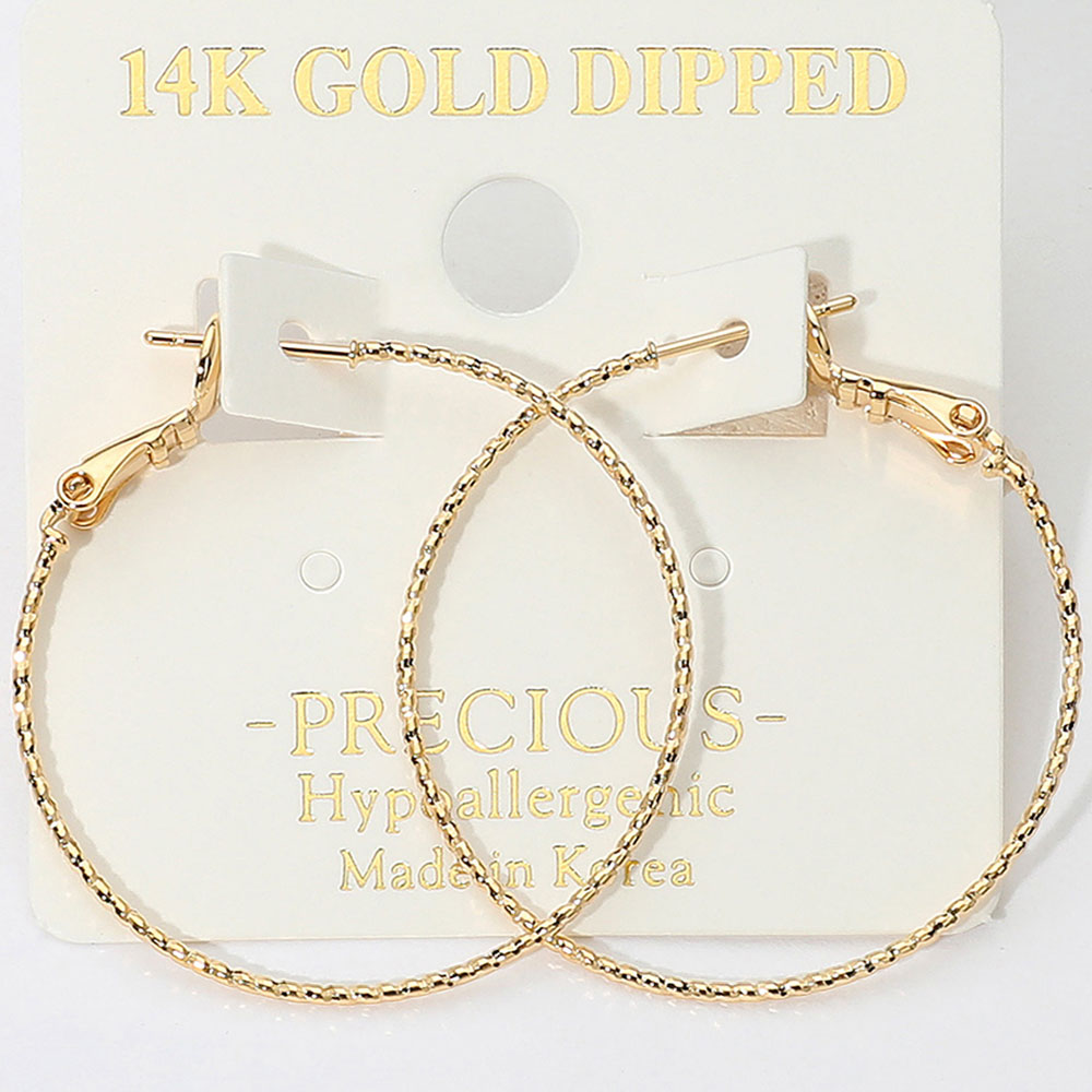 Details • Size : 1.4" X 1.4" • Omega Back • Lightweight hoop earrings featuring a thin, textured surface for a stylish statement. Designed for comfort and elegance, these hoops are perfect for daily wear or special events. An easy match for casual and dressy looks alike. • Hypoallergenic • Made In Korea • Gold Dipped
