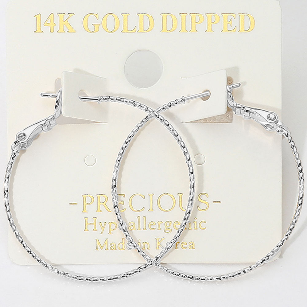 Details • Size : 1.4" X 1.4" • Omega Back • Lightweight hoop earrings featuring a thin, textured surface for a stylish statement. Designed for comfort and elegance, these hoops are perfect for daily wear or special events. An easy match for casual and dressy looks alike. • Hypoallergenic • Made In Korea • Gold Dipped