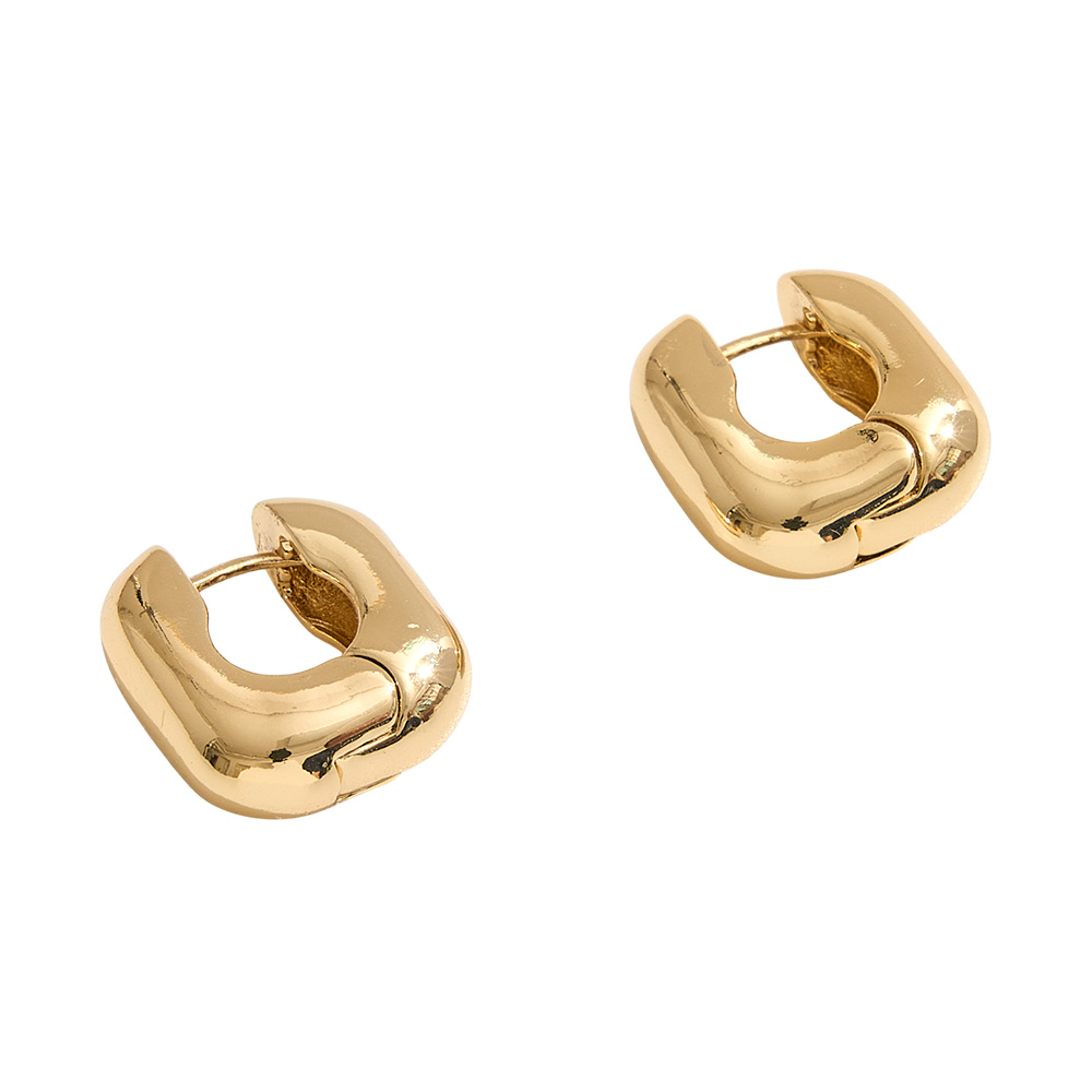 Details • Size : 0.6" X 0.7" • Huggie Back • These chunky square hoop earrings feature a bold geometric silhouette with a smooth, polished finish for a modern twist on classic hoops. Their sculptural shape adds edge and elegance, making them a versatile statement piece for both casual and elevated looks. • Brass • Gold Dipped • Hypoallergenic • Lead and Nickel Compliant • Made In Korea