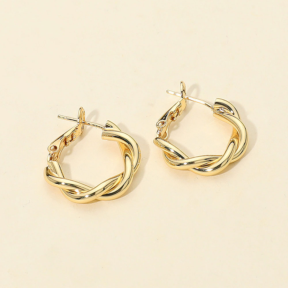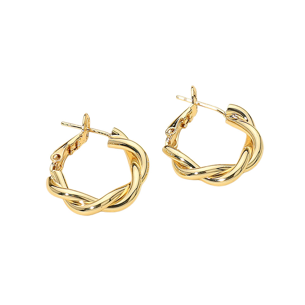 Details • Size : 0.8" X 0.8" • Omega Back • Chic small hoop earrings featuring a braided twisted design that adds a touch of sophistication to any outfit. Lightweight and comfortable for all-day wear, these versatile hoops are perfect for layering with other jewelry or wearing alone for a simple yet elegant accessory style. • Brass • Gold Dipped • Hypoallergenic • Lead and Nickel Compliant • Made In Korea