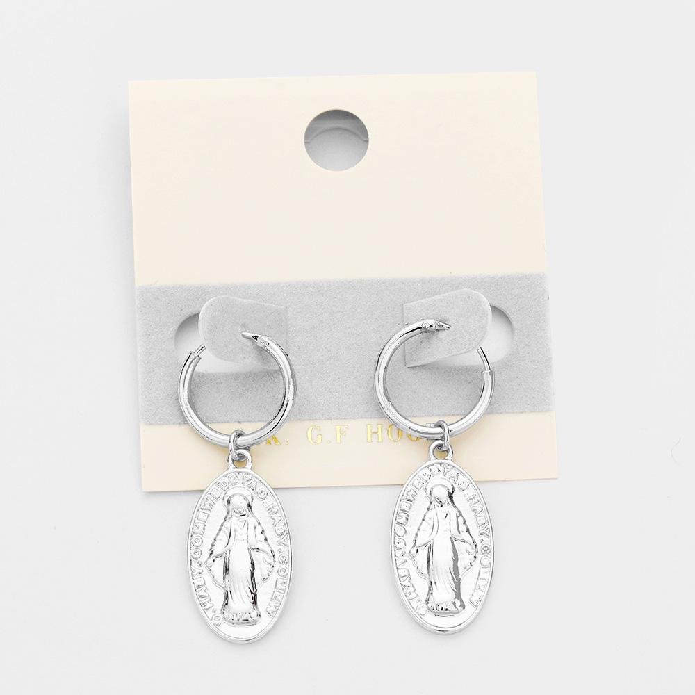 Stainless Steel Mother of Pearl CZ Stone Rim Virgin Mary Accent Evil Eye Charm Dangle Huggie Earrings