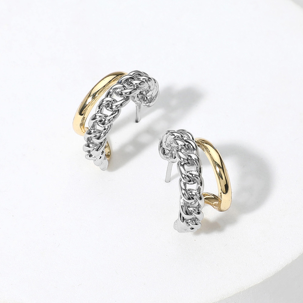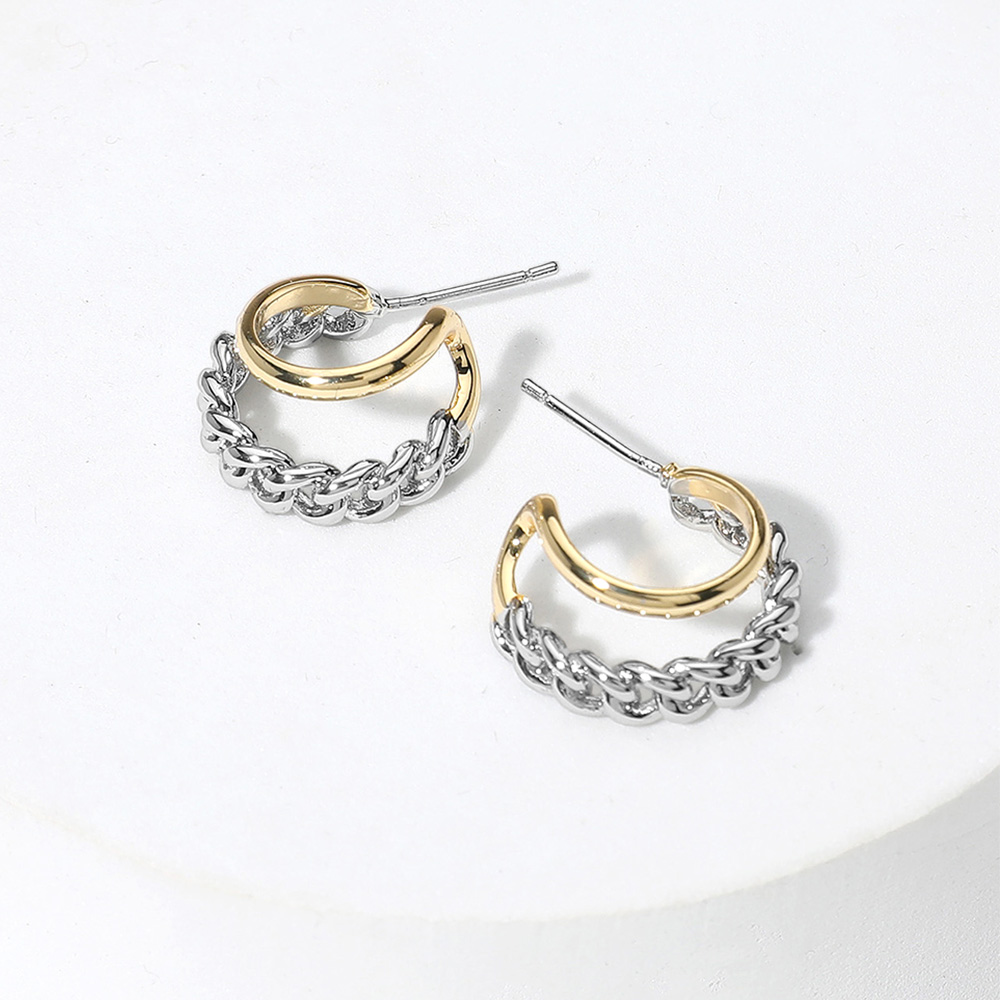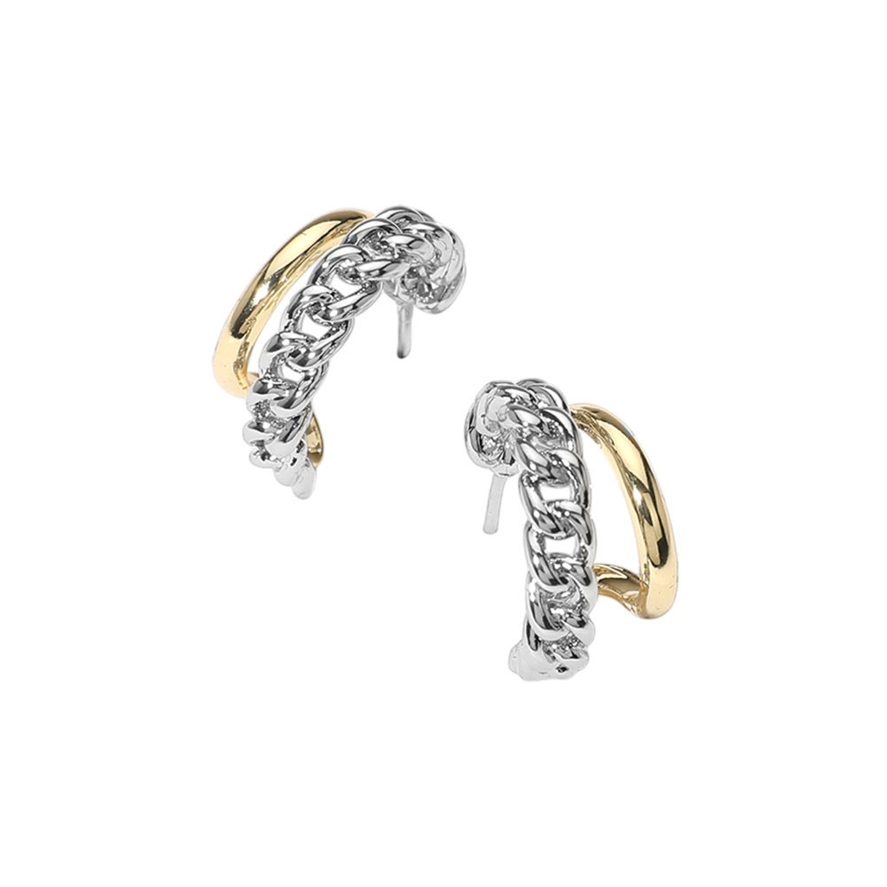 Details • Size : 0.75" X 0.75" X 0.4" • Post Back • Elegant dual hoop earrings featuring a sleek curved band paired with a textured braided chain. A versatile statement piece that complements both casual and formal looks with subtle sophistication. • Gold Dipped