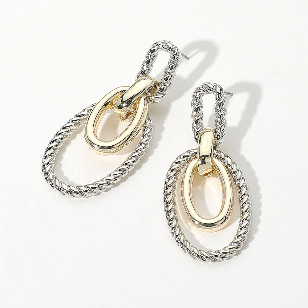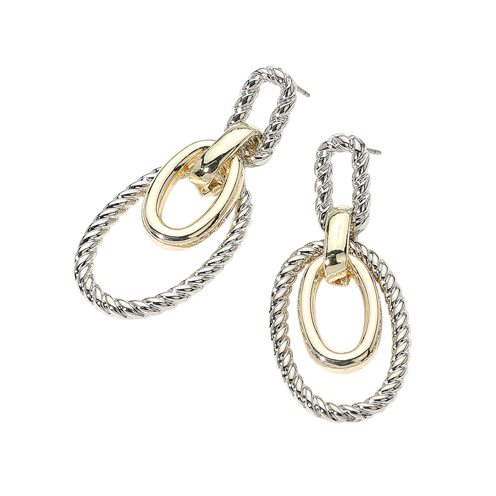 Details • Size : 0.75" X 1.8" • Post Back • Elegant drop earrings featuring intertwined oval links with textured and smooth finishes. Their timeless design makes them a versatile accessory for both everyday wear and special occasions. • Gold Dipped