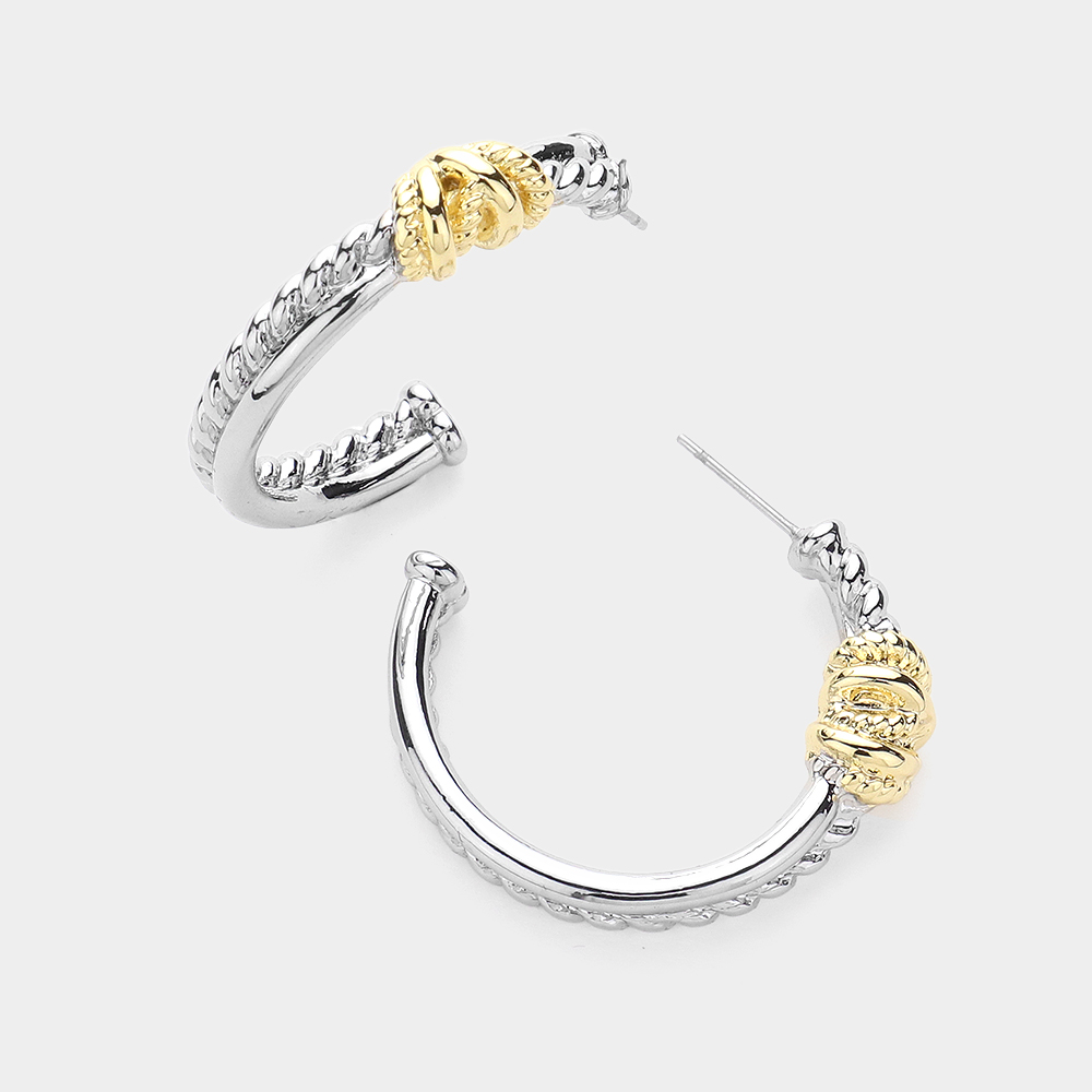 Details • Size : 1.25" X 1.25" • Post Back • These hoop earrings feature a blend of smooth and rope-textured finishes, accented by twisted knot details for added elegance. A perfect mix of classic and contemporary style, ideal for elevating everyday outfits or complementing formal looks. Great for gifting or personal wear. • Gold Dipped