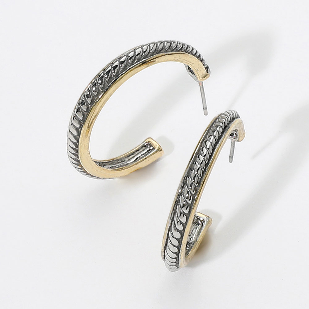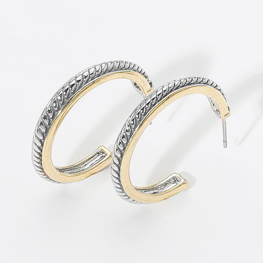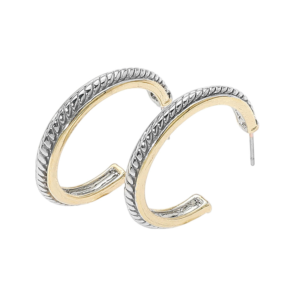 Details • Size : 1.25" X 1.25" • Post Back • Make a bold statement with these twisted edge hoop earrings featuring a sleek two-tone finish and sculptural design. Perfect for adding dimension and detail to casual or dressed-up outfits, these earrings offer a standout accessory that complements modern and classic looks. • Gold Dipped