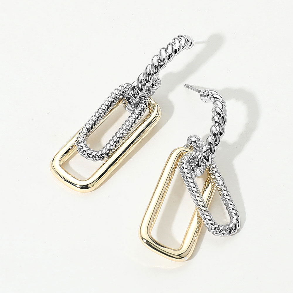 Details • Size : 0.6" X 1.75" • Post Back • Modern drop earrings featuring interlocking twisted and smooth rectangular links. A bold yet refined design that adds a contemporary edge to any outfit, perfect for elevating both day and evening wear. • Gold Dipped