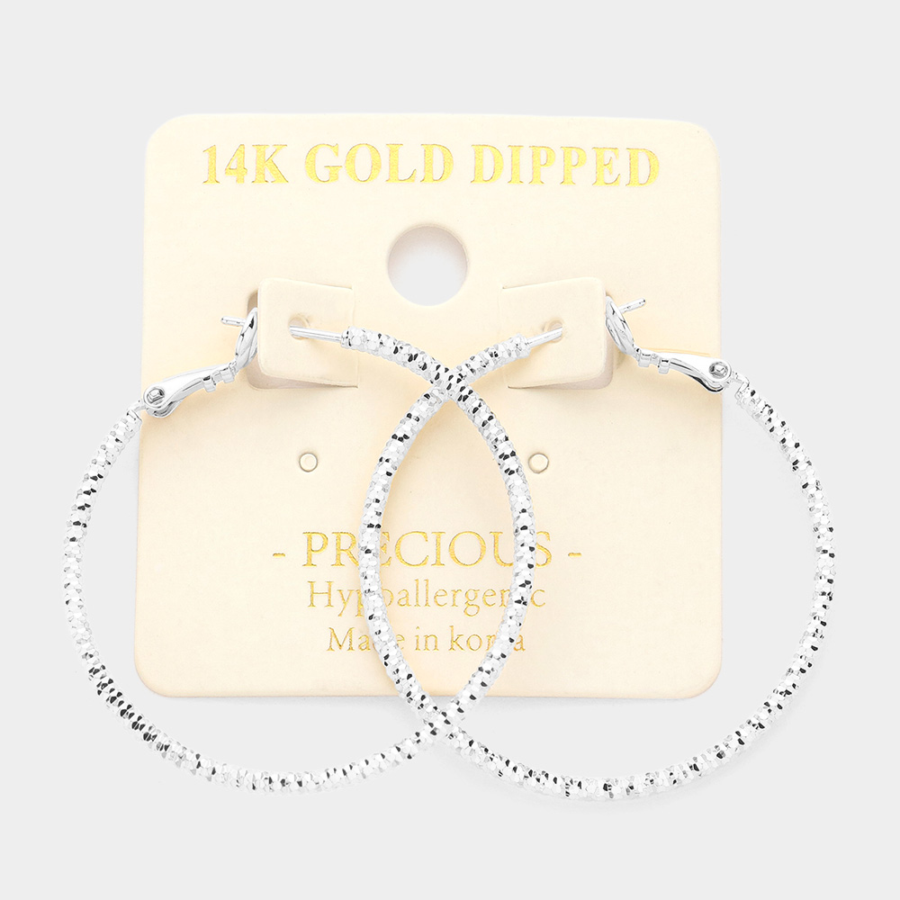 14K White Gold Dipped 1.6 Inch Textured Metal Hoop Earrings