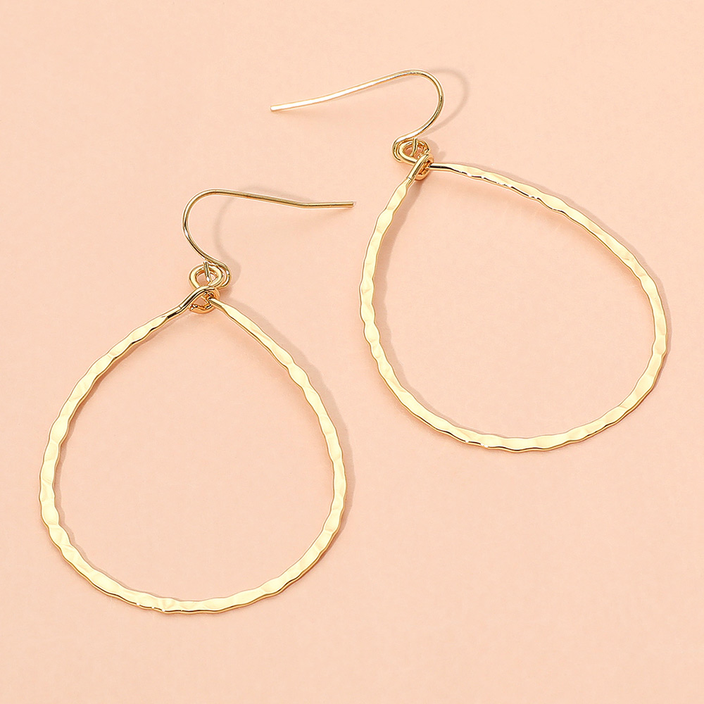 Details • Size : 1.5" X 2.5" • Fish Hook Back • Lightweight hammered teardrop hoop earrings designed for a chic and modern look. Perfect for everyday wear or adding a stylish touch to evening outfits. • Lead and Nickel Compliant • Gold Dipped • Brass