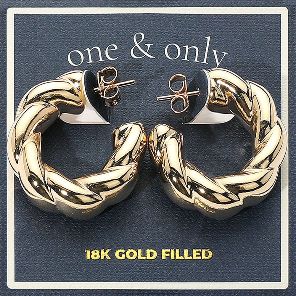 Details • Size : 1.2" X 1.2" X 0.3" • Post Back • Make a statement with these 18K gold filled braided hoop earrings. Featuring a twisted, bold design and a polished finish, these hypoallergenic earrings blend elegance with edge. Perfect for adding glamour to everyday outfits or completing your evening ensemble. • Gold Filled • Lead and Nickel Compliant • Made In Brazil