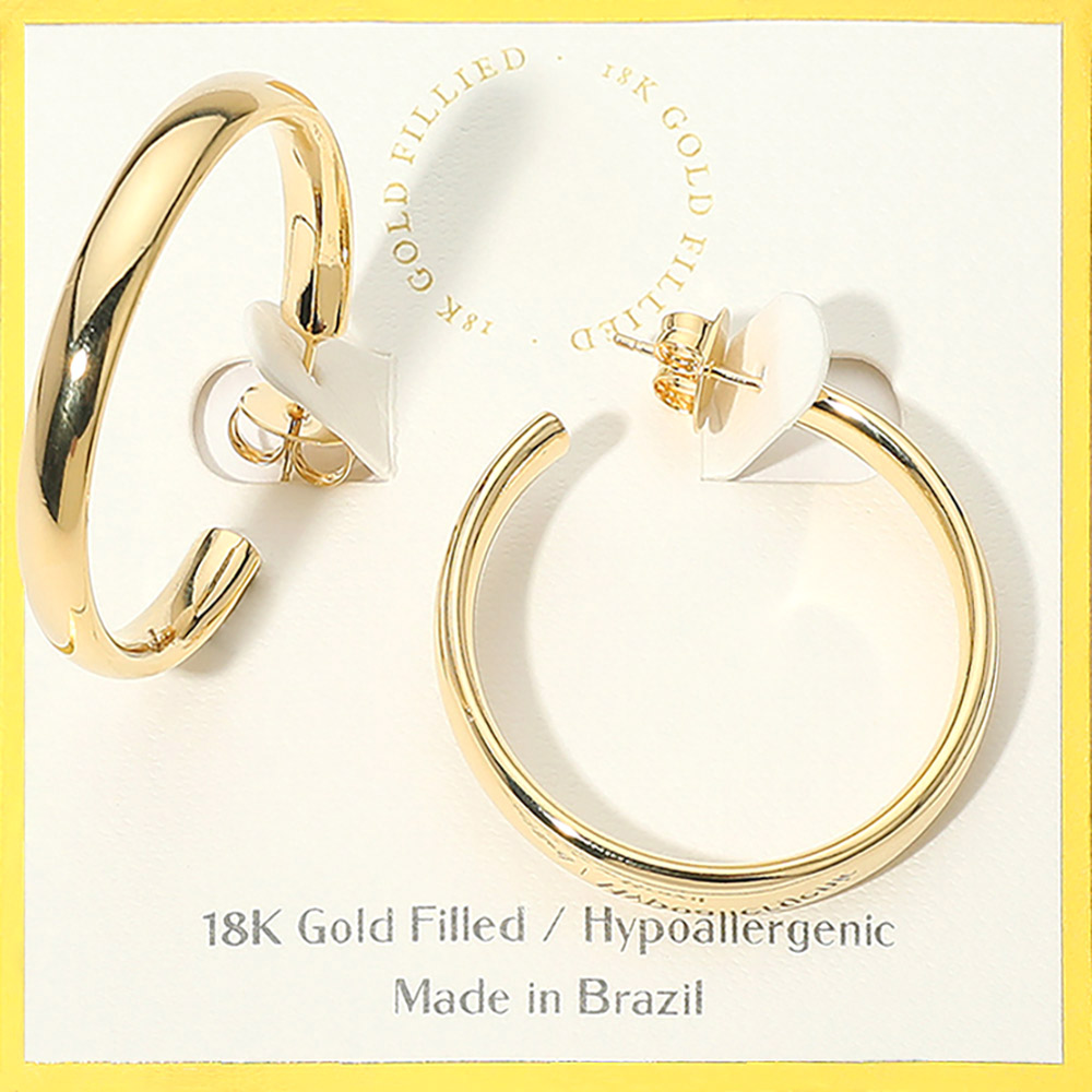 Details • Size : 1.5" X 1.5" X 0.2" • Post Back • Water Resistant and Tarnish Free • These bold open hoop earrings feature a sleek and contemporary design that adds a touch of sophistication to any outfit. Lightweight and hypoallergenic, they are crafted for both comfort and durability, making them a stylish choice for everyday wear or evening elegance. • Gold Filled • Hypoallergenic • Lead and Nickel Compliant • Made In Brazil