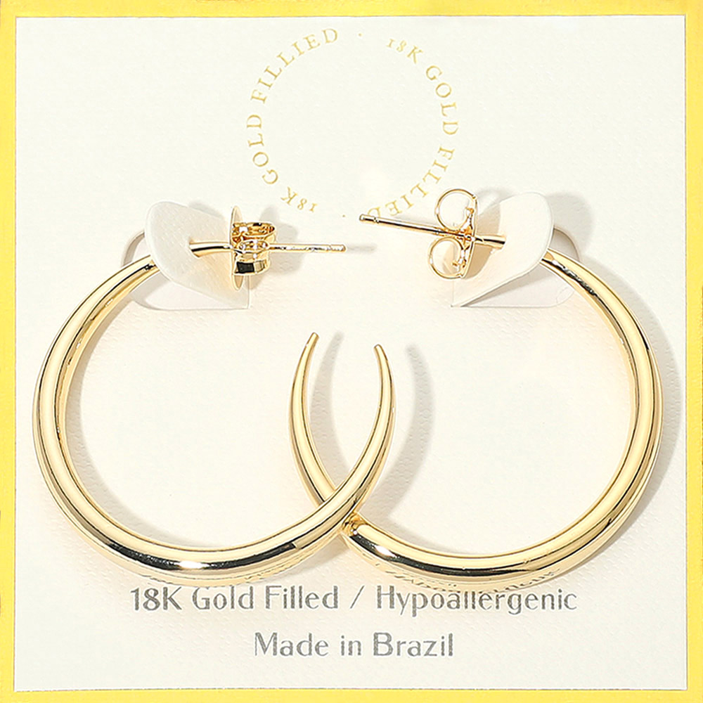 Details • Size : 1.5" X 1.5" • Post Back • Water Resistant and Tarnish Free • These modern open hoop earrings showcase a minimalist curve that blends elegance with everyday wear. Hypoallergenic and designed for comfort, they are lightweight yet durable, making them a versatile accessory for both casual outfits and special occasions. • Lead and Nickel Compliant • Hypoallergenic • Gold Filled • Made In Brazil