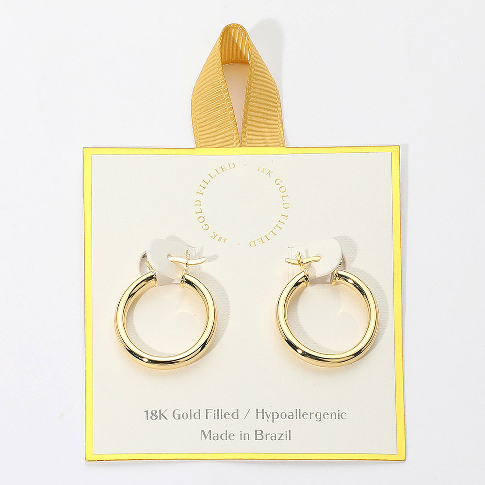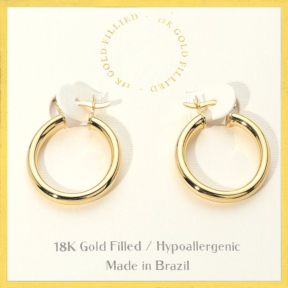Details • Size : 0.9" X 1.1" • Pin Catch • Timeless elegance meets everyday comfort with these classic hoop earrings. Crafted from 18K gold filled material and hypoallergenic for sensitive skin, they’re the perfect staple accessory. Proudly made in Brazil. • Gold Filled • Hypoallergenic • Lead and Nickel Compliant • Made In Brazil