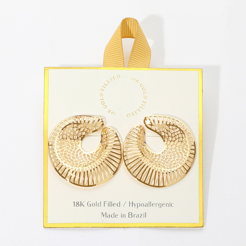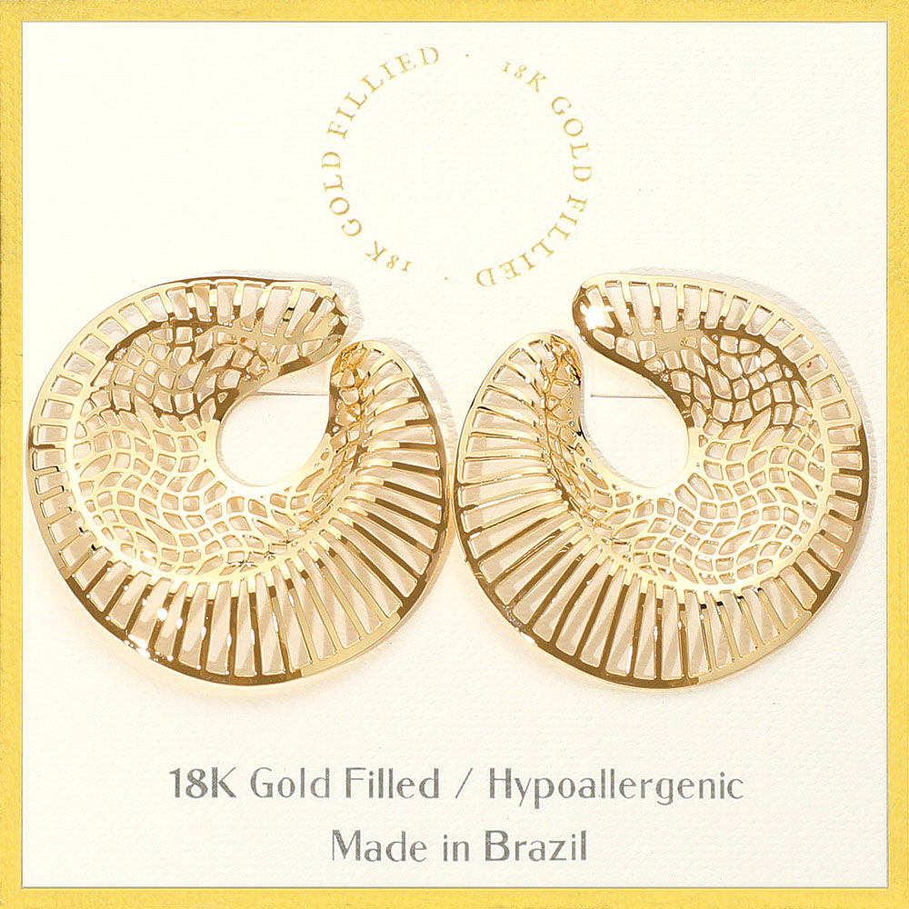 Details • Size : 1.4" X 1.4" • Post Back • Elevate your style with these 18K gold filled abstract fan-shaped hoop earrings featuring intricate openwork detailing. Lightweight and hypoallergenic for comfortable, all-day wear. • Gold Filled • Hypoallergenic • Lead and Nickel Compliant • Made In Brazil