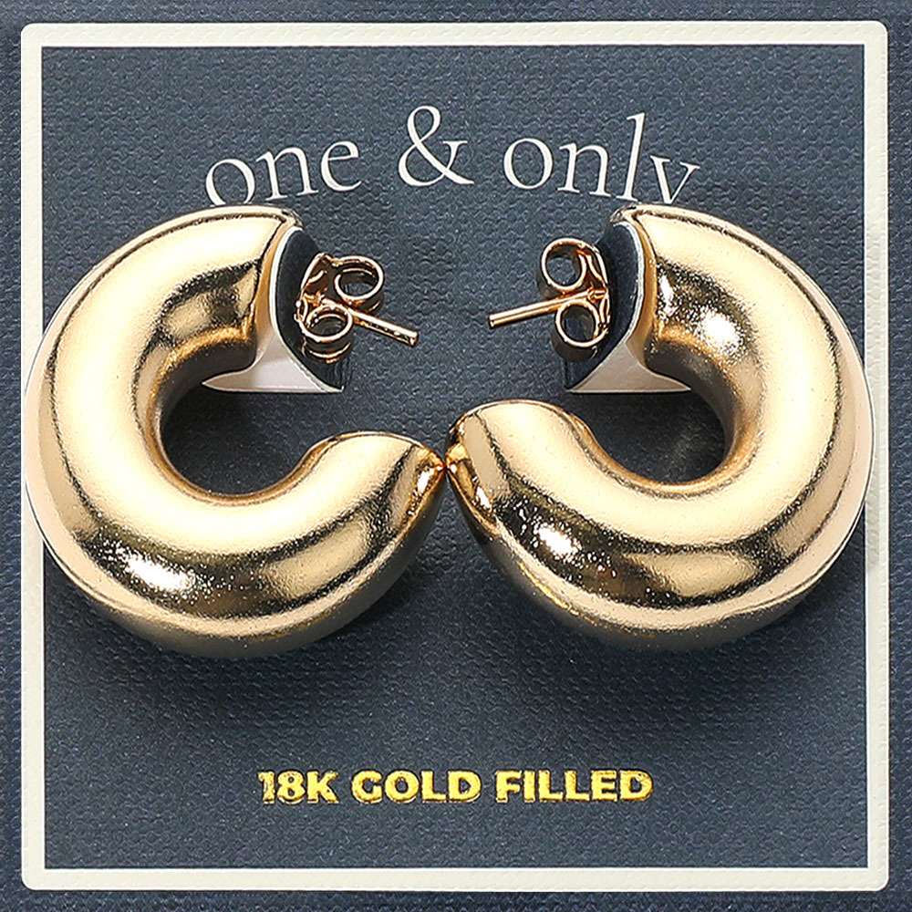 Details • Size : 1.25" X 1.25" X 0.4" • Post Back • Discover bold elegance with these thick curved hoop earrings, crafted in 18K gold filled metal. Featuring a sleek rounded design with a rich polished texture, these hypoallergenic earrings offer both comfort and timeless style. A standout accessory for elevating any outfit. • Gold Filled • Lead and Nickel Compliant • Made In Brazil