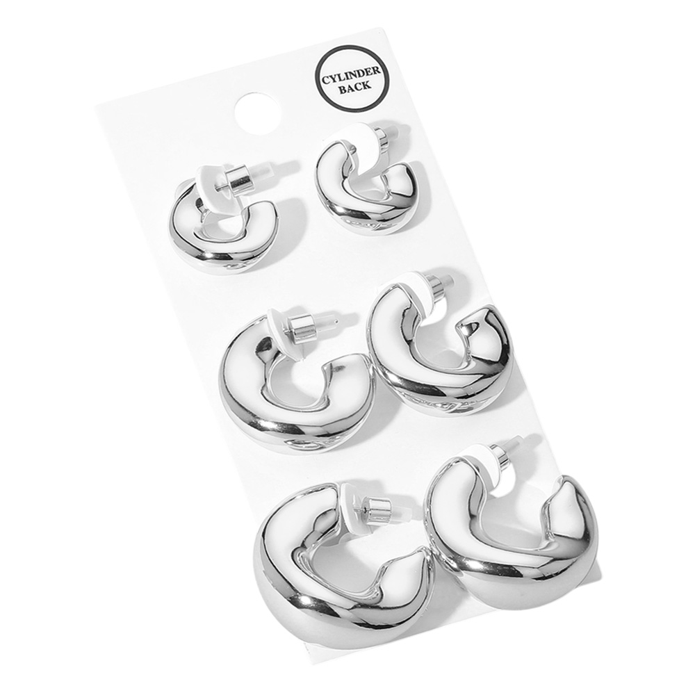 Details • Size : 0.75" L - 1.25" L • Cylinder Back • Stylish set of three pairs of chunky hoop earrings in graduated sizes. Each pair offers a bold, modern silhouette perfect for layering or wearing solo. Ideal for everyday elegance or dressing up looks. • Lead and Nickel Compliant