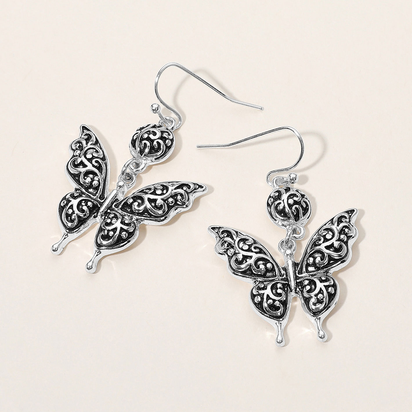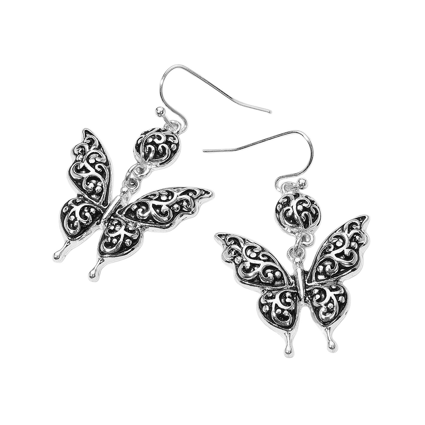 Details • Size : 1" X 1.75" • Fish Hook Back • Elegant dangle earrings featuring intricate filigree butterfly designs. A delicate and nature-inspired accessory, perfect for adding whimsical charm and timeless beauty to any outfit. • Lead and Nickel Compliant