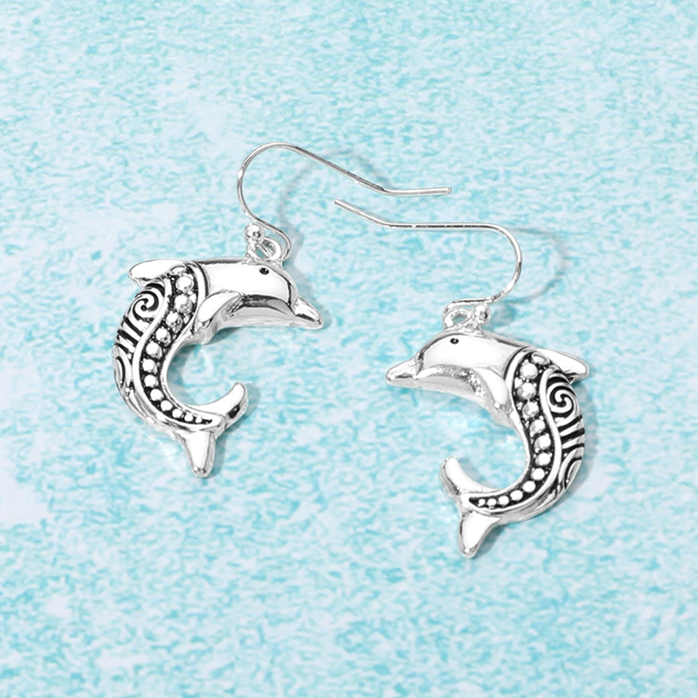 Details • Size : 0.75" X 1.5" • Fish Hook Back • Stylish dolphin dangle earrings with tribal engravings in shiny silver-tone metal. A fun and beachy accessory for ocean lovers, surfers, or coastal-inspired fashion. Lightweight and eye-catching. • Lead and Nickel Compliant