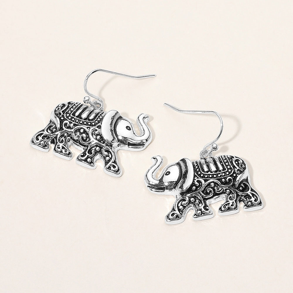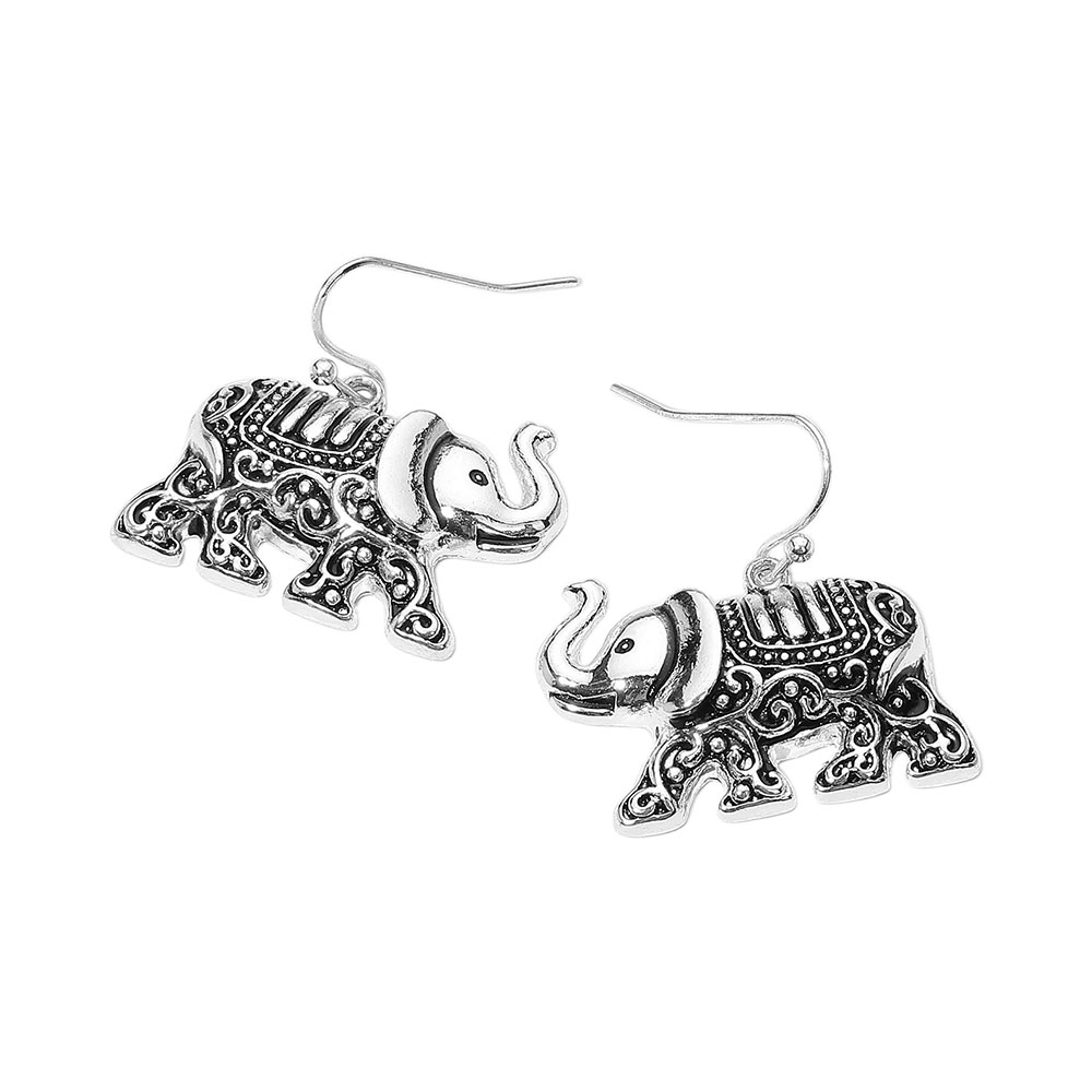 Details • Size : 1.2" X 1.2" • Fish Hook Back • Artistic dangle earrings featuring intricately detailed elephant designs. A unique accessory that adds cultural charm and personality, perfect for everyday wear or as a thoughtful gift for animal lovers. • Lead and Nickel Compliant
