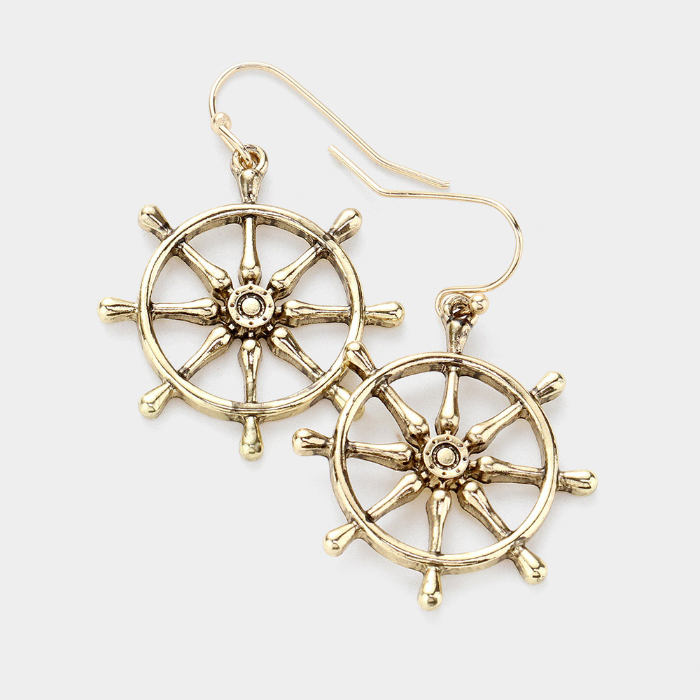 Antique Metal Ship Wheel Dangle Earrings