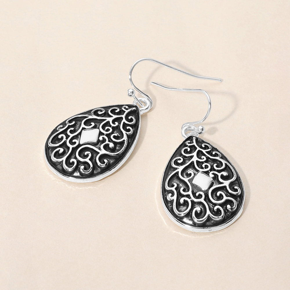 Details • Size : 0.75" X 1.5" • Fish Hook Back • Elegant teardrop-shaped dangle earrings featuring intricate filigree patterns with a central accent. Perfect for adding a touch of classic sophistication to both casual and formal outfits. • Lead and Nickel Compliant