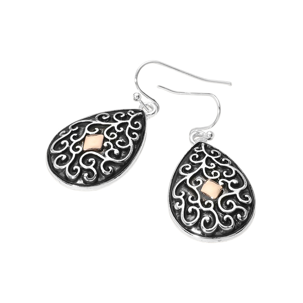 Details • Size : 0.75" X 1.5" • Fish Hook Back • Elegant teardrop-shaped dangle earrings featuring intricate filigree patterns with a central accent. Perfect for adding a touch of classic sophistication to both casual and formal outfits. • Lead and Nickel Compliant