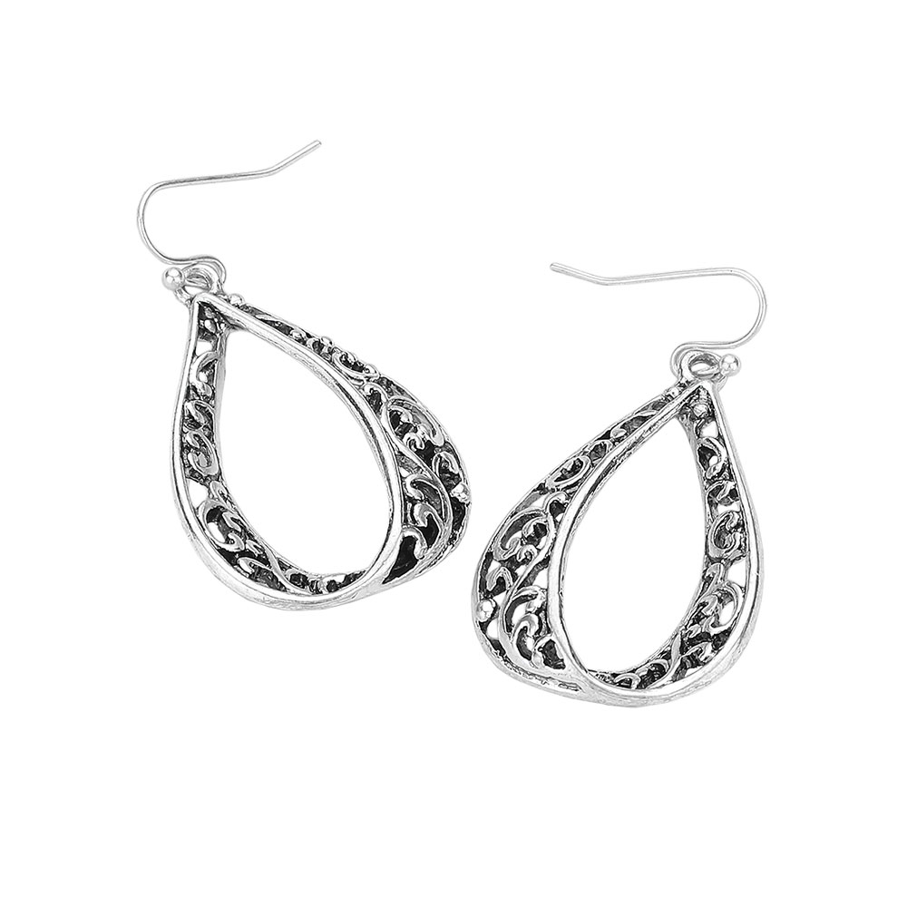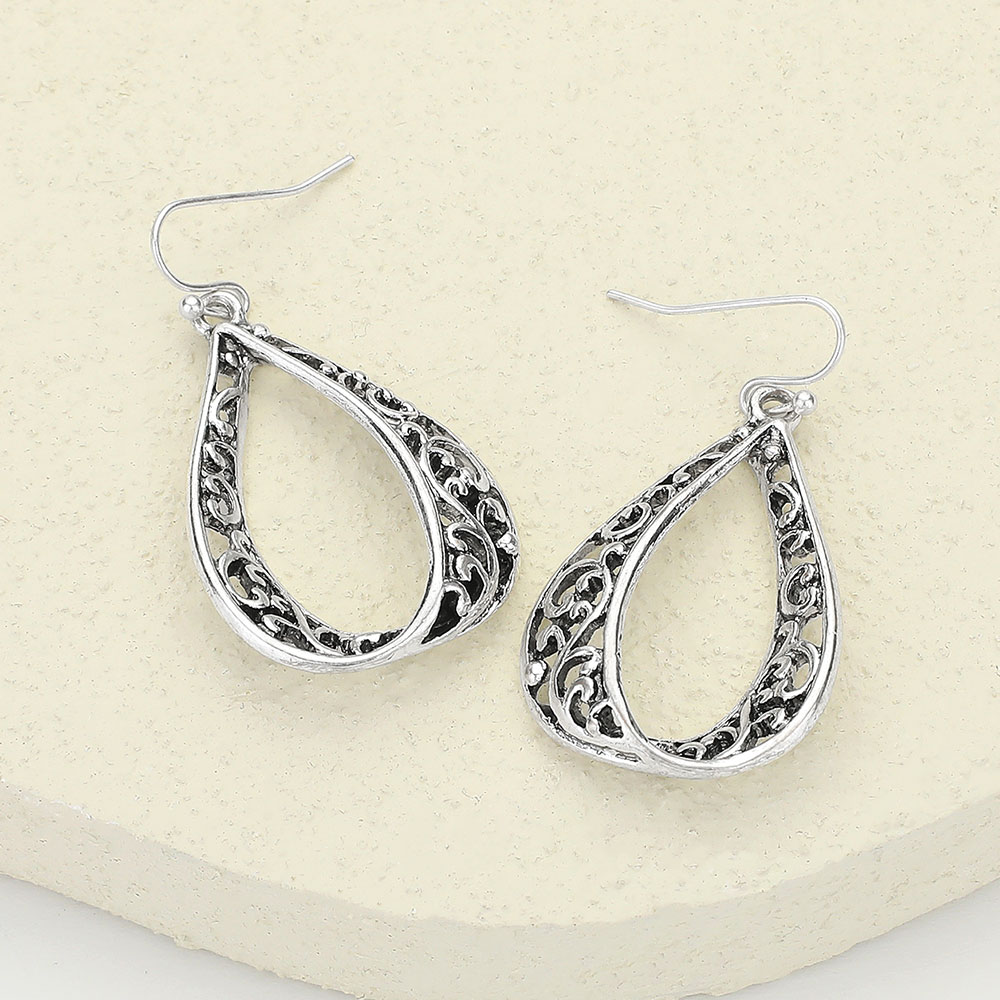 Details • Size : 1" X 1.8" • Fish Hook Back • Elegant teardrop filigree earrings featuring intricate openwork design for a timeless statement. Lightweight and versatile, they elevate both casual and dressy looks with a refined, vintage-inspired charm. • Lead and Nickel Compliant