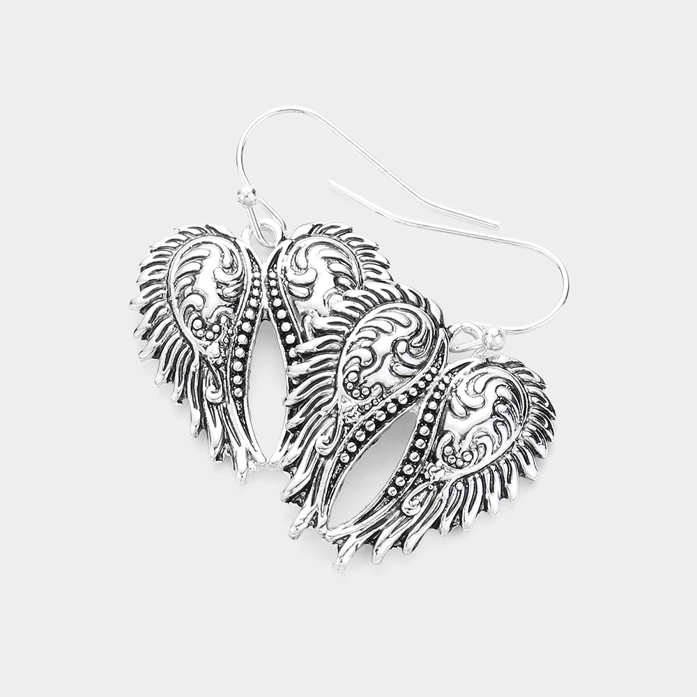 Details • Size : 0.8" X 1.3" • Fish Hook Back • Stylish angel wing drop earrings featuring intricate detailing and a lightweight design. Perfect for adding a touch of boho-chic elegance to casual or dressy outfits. Ideal for gifting or expressing a unique sense of style with symbolic wing motifs and artistic craftsmanship. • Lead and Nickel Compliant
