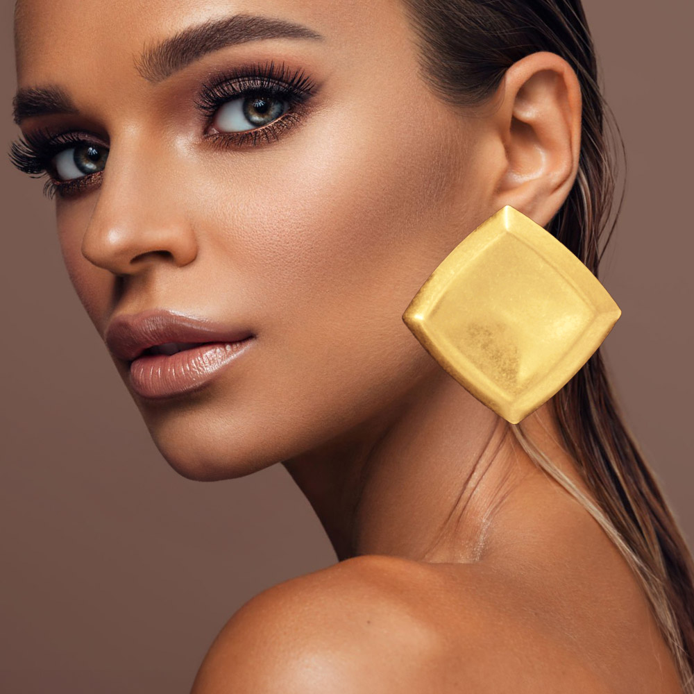 Details • Size : 2.5" X 2.5" • Post Back • These geometric statement earrings feature a striking, sculpted silhouette that adds modern sophistication to any look. Their bold shape creates a refined yet contemporary accent, offering effortless style perfect for both elevated and everyday outfits. • Lead and Nickel Compliant