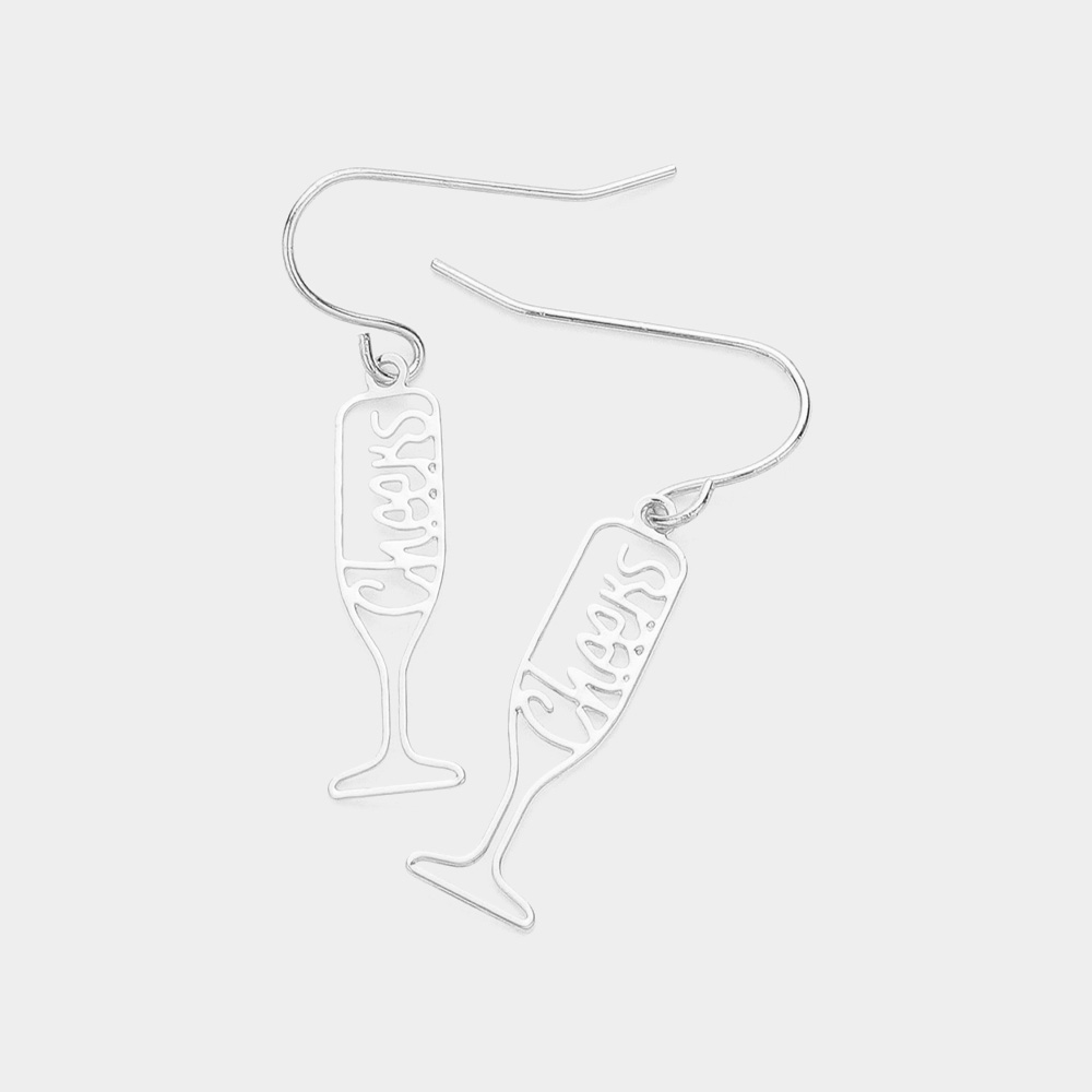 Brass Metal Cheers Message Champagne Glass Dangle Earrings