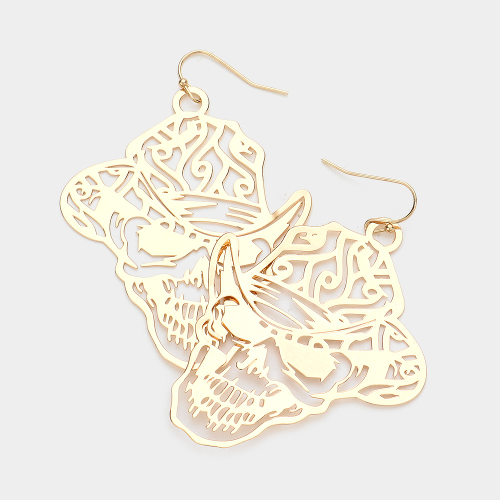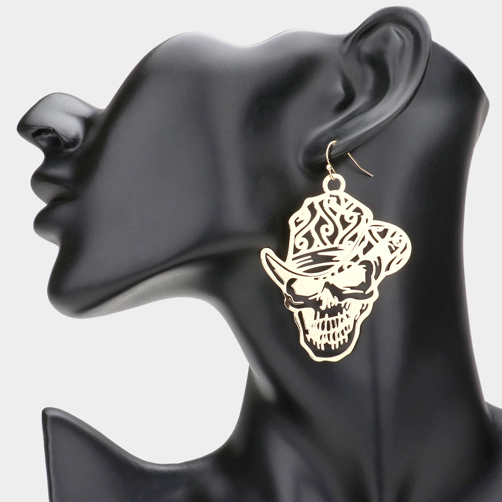 Details • Size : 1.75" X 2.5" • Fish Hook Back • Add edgy charm to your accessories with these skeleton cowboy hat earrings featuring an intricate cutout design. Perfect for themed events or statement wear, these earrings blend western style with bold character for a standout finishing touch. • Lead and Nickel Compliant • Brass