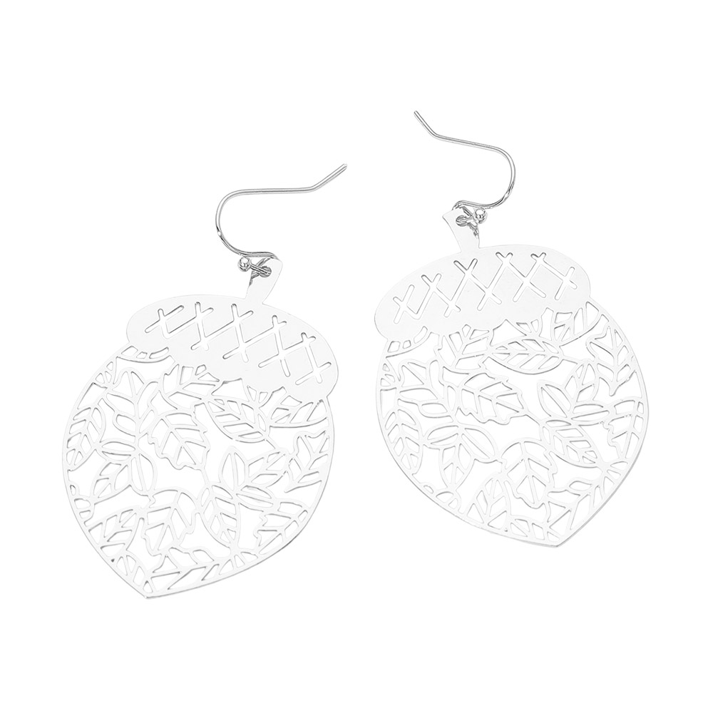 Details • Size : 1.4" X 2.4" • Fish Hook Back • Add a touch of woodland charm with these leafy acorn cutout drop earrings. Designed with intricate leaf patterns and a delicate acorn silhouette, they bring nature-inspired elegance to any outfit. Perfect for casual wear or dressing up with a whimsical and stylish flair. • Brass • Lead and Nickel Compliant