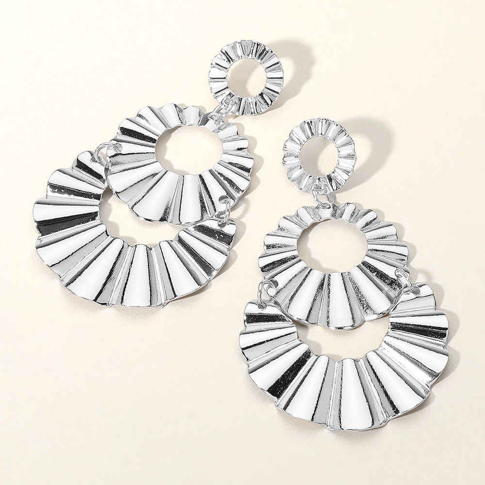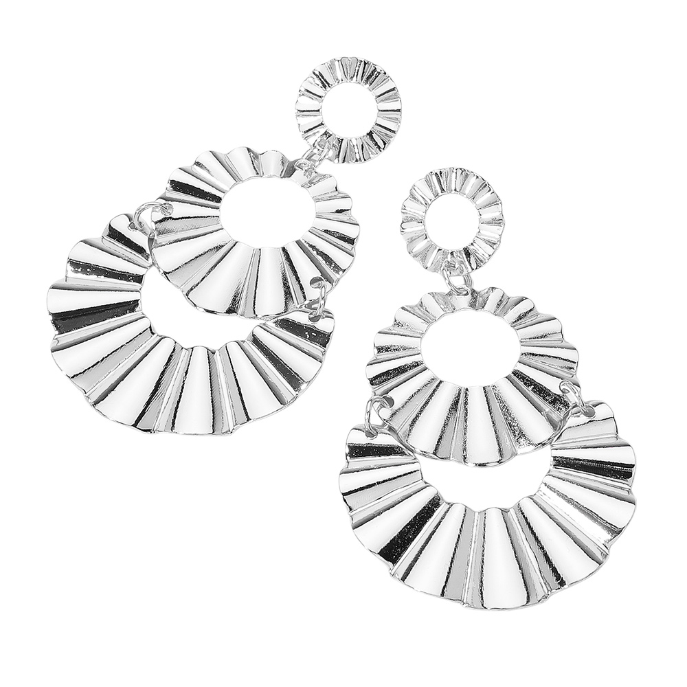 Details • Size : 1.8" X 3.3" • Post Back • Turn heads with these layered fan-shaped drop earrings. Featuring a bold circular design with sculpted fan details, they add texture and movement to any look. Perfect for parties, nights out, or adding statement style to everyday outfits. • Lead and Nickel Compliant