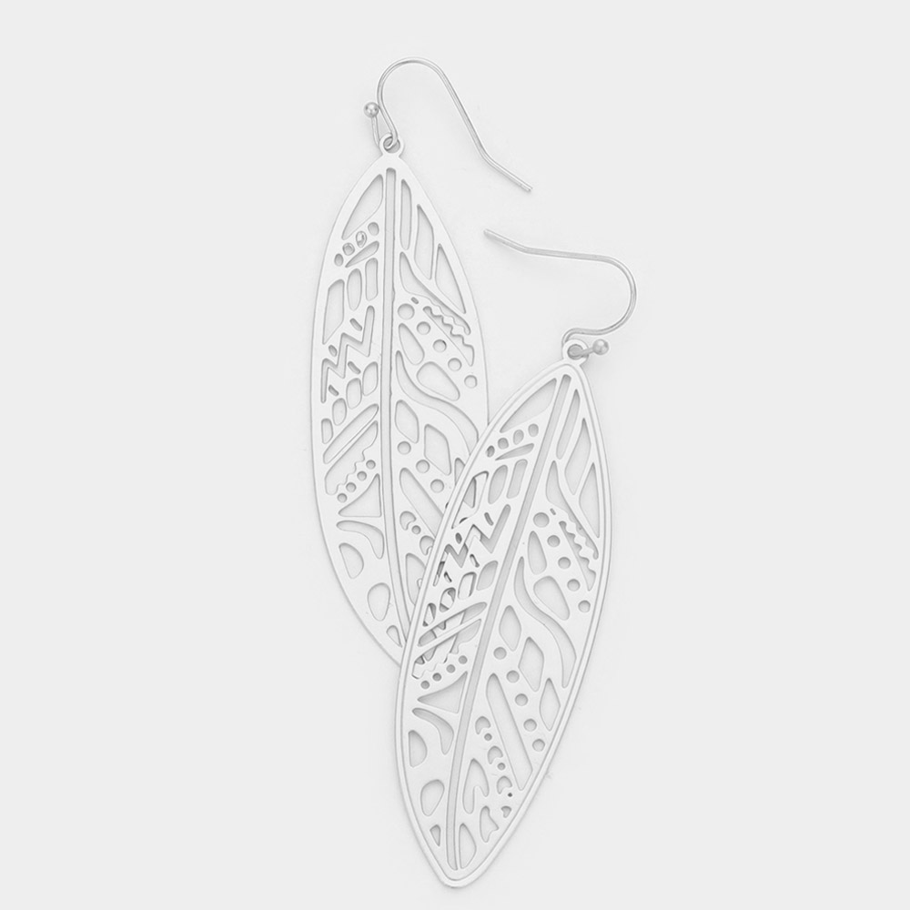 Filigree Flower Leaf Detailed Brass Metal Marquise Dangle Earrings