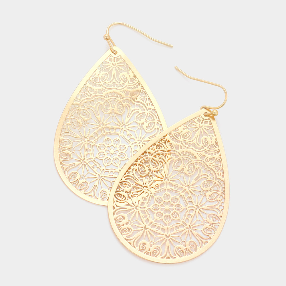 Brass Metal Flower Filigree Teardrop Dangle Earrings