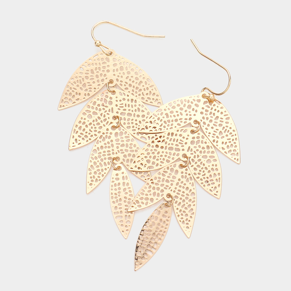 Filigree Flower Leaf Detailed Brass Metal Marquise Dangle Earrings