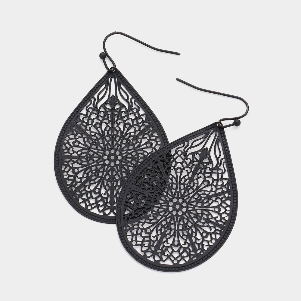 Rhinestone Embellished Metal Filigree Teardrop Dangle Earrings
