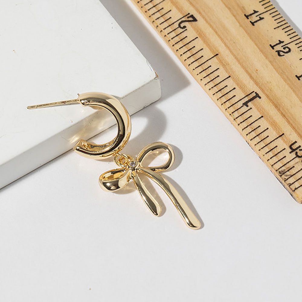 • Elegant crescent hoop earrings accented with a smooth bow drop that adds soft movement and feminine charm. The balanced silhouette blends modern curves with a classic bow detail, making these earrings easy to style for everyday wear, gifting, and boutique collections seeking timeless yet playful jewelry designs.