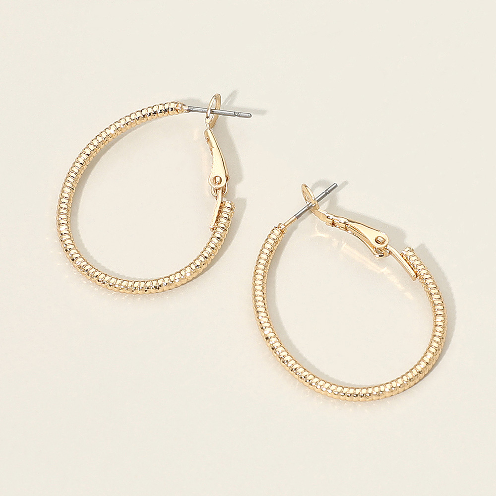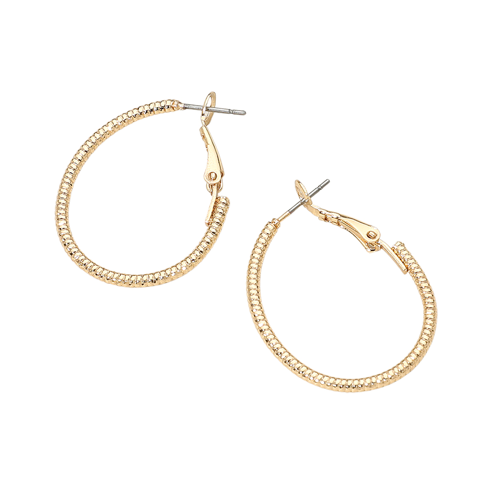 Details • Size : 1" X 1.25" • Omega Back • Chic small hoop earrings featuring a refined textured finish and a slim, lightweight silhouette for comfortable all-day wear. A versatile accessory perfect for everyday outfits or adding a subtle polished touch to evening looks. • Lead and Nickel Compliant • Gold Dipped