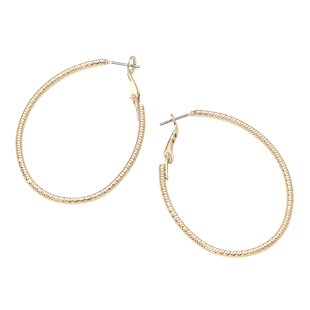 Details • Size : 1.5" X 2" • Omega Back • Elegant slim hoop earrings featuring a refined textured finish and a lightweight silhouette for comfortable everyday wear. A versatile accessory that adds modern polish to casual outfits or enhances evening looks with a clean, minimal style. • Lead and Nickel Compliant • Gold Dipped
