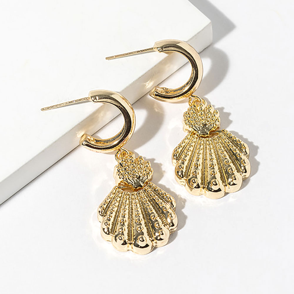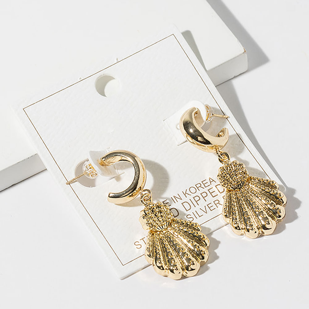 • Scallop shell drop earrings featuring a sculpted shell motif with dimensional texture and elegant movement. Designed to complement resort looks, coastal edits, and everyday styling, these statement drops offer timeless seaside charm for boutique assortments and gift-ready displays.