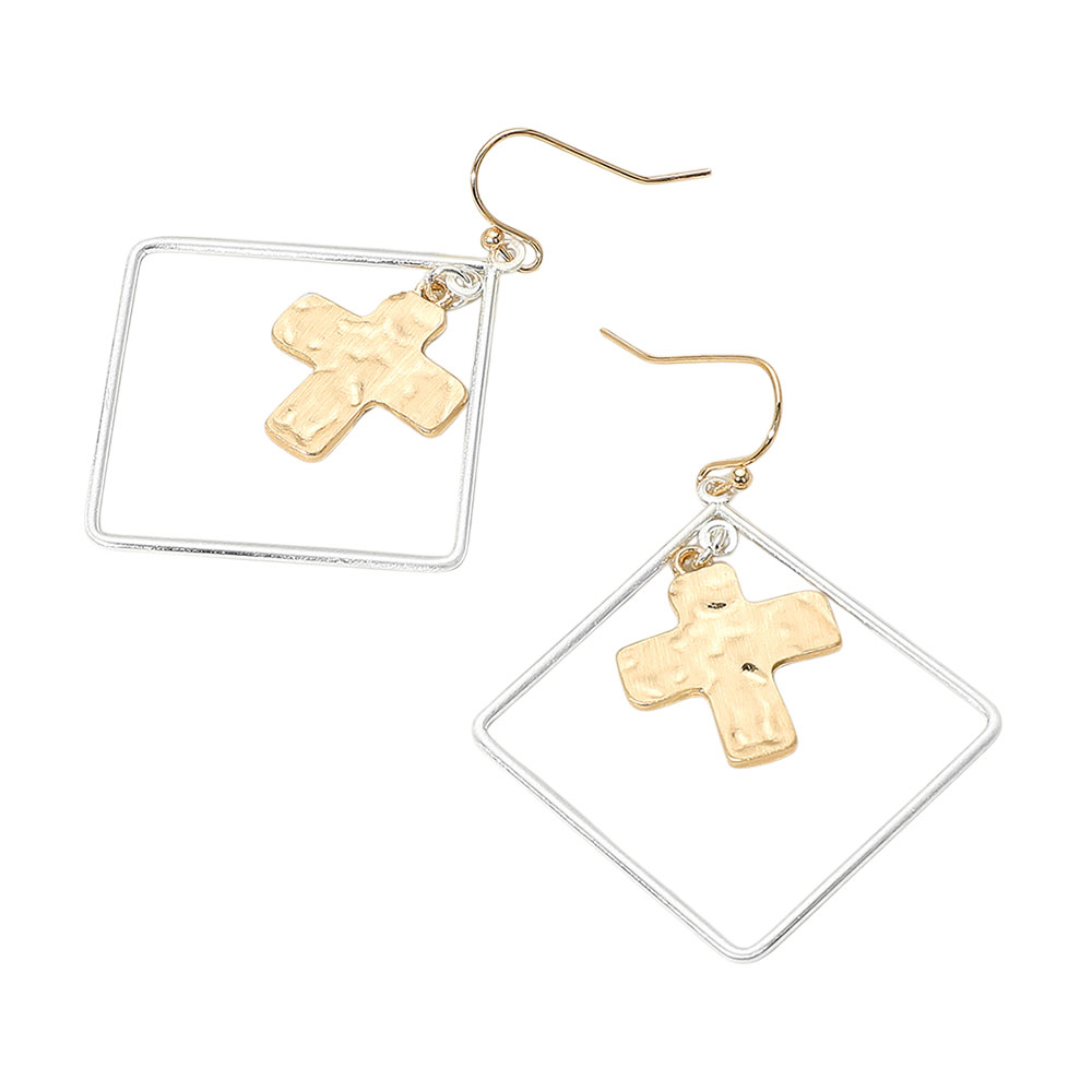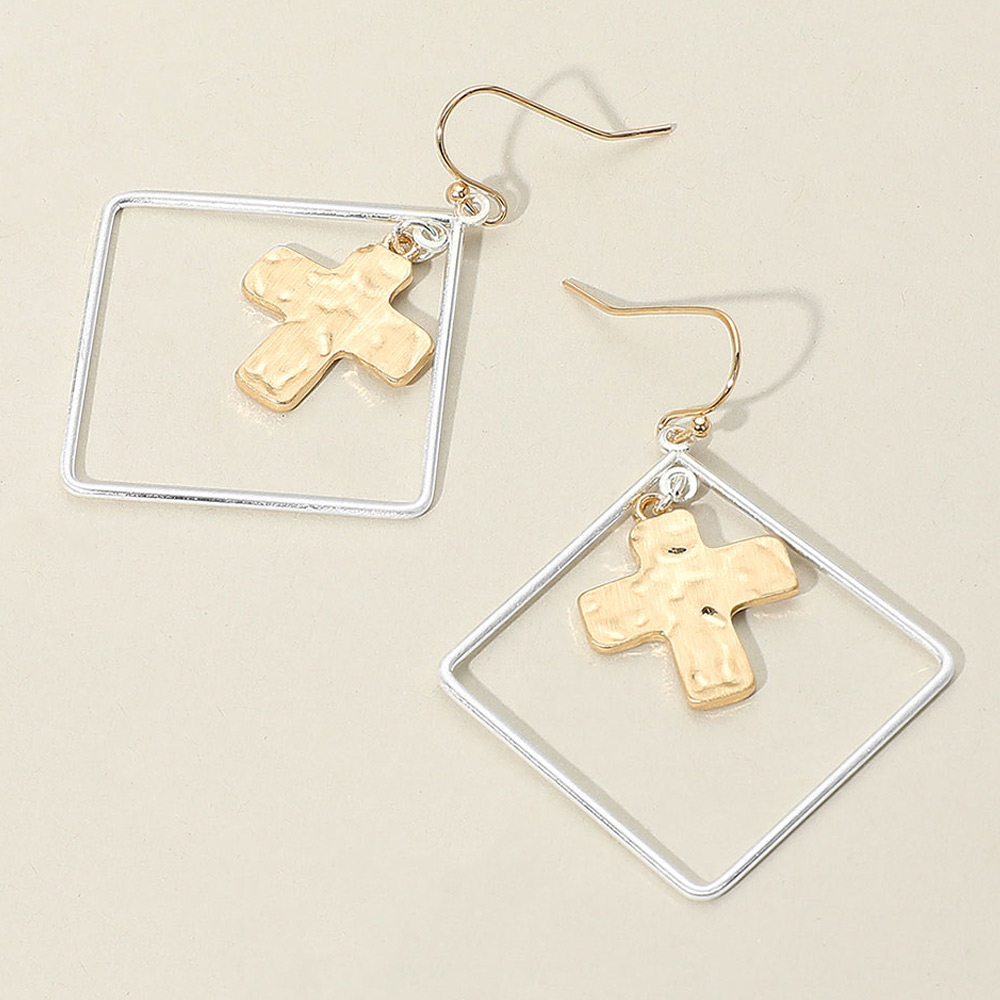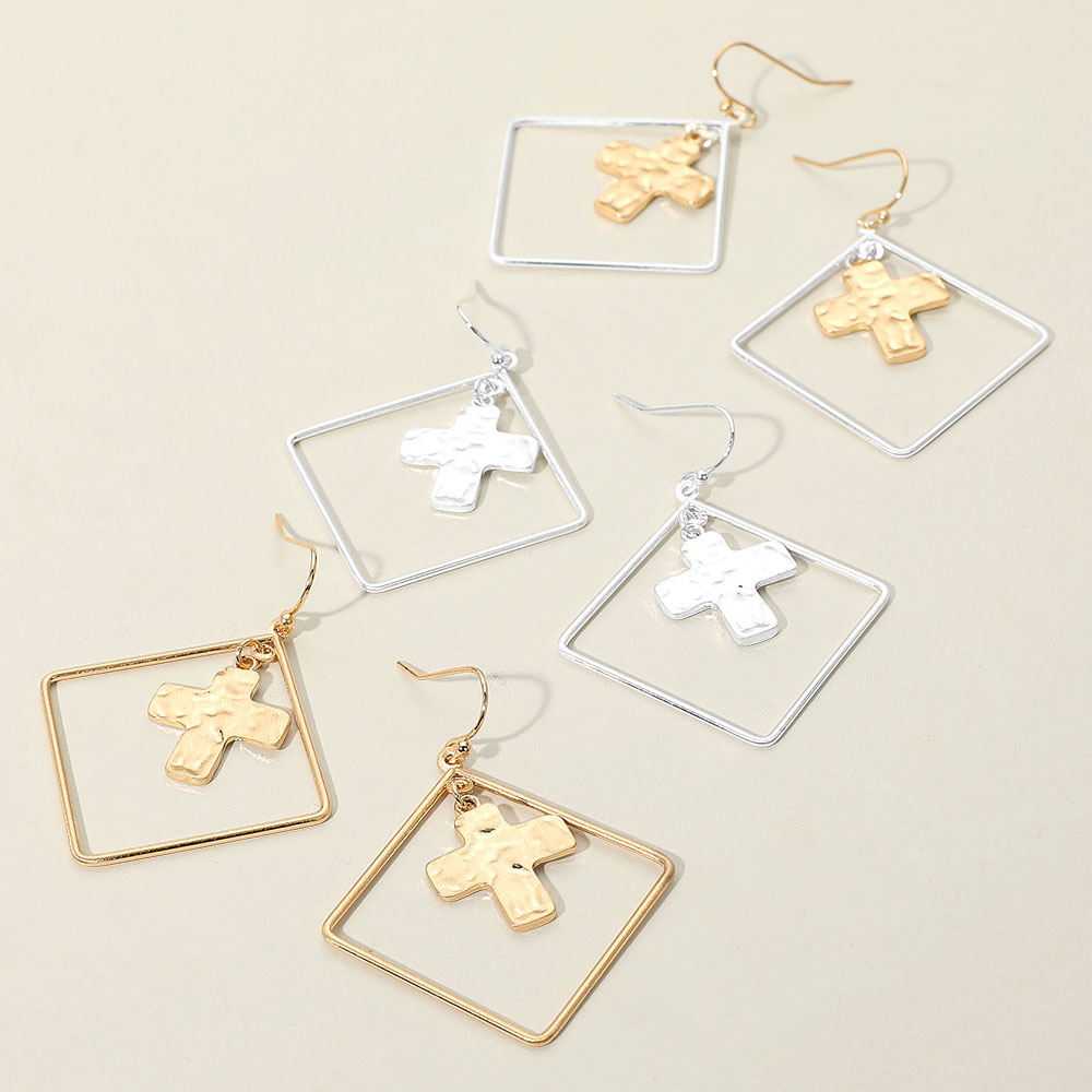 Details • Size : 1.7" X 2" • Fish Hook Back • Modern dangle earrings featuring a minimalist open square frame with a suspended textured cross charm. A stylish mix of geometric and symbolic design, perfect for casual, boho, or faith-inspired looks. • Lead and Nickel Compliant