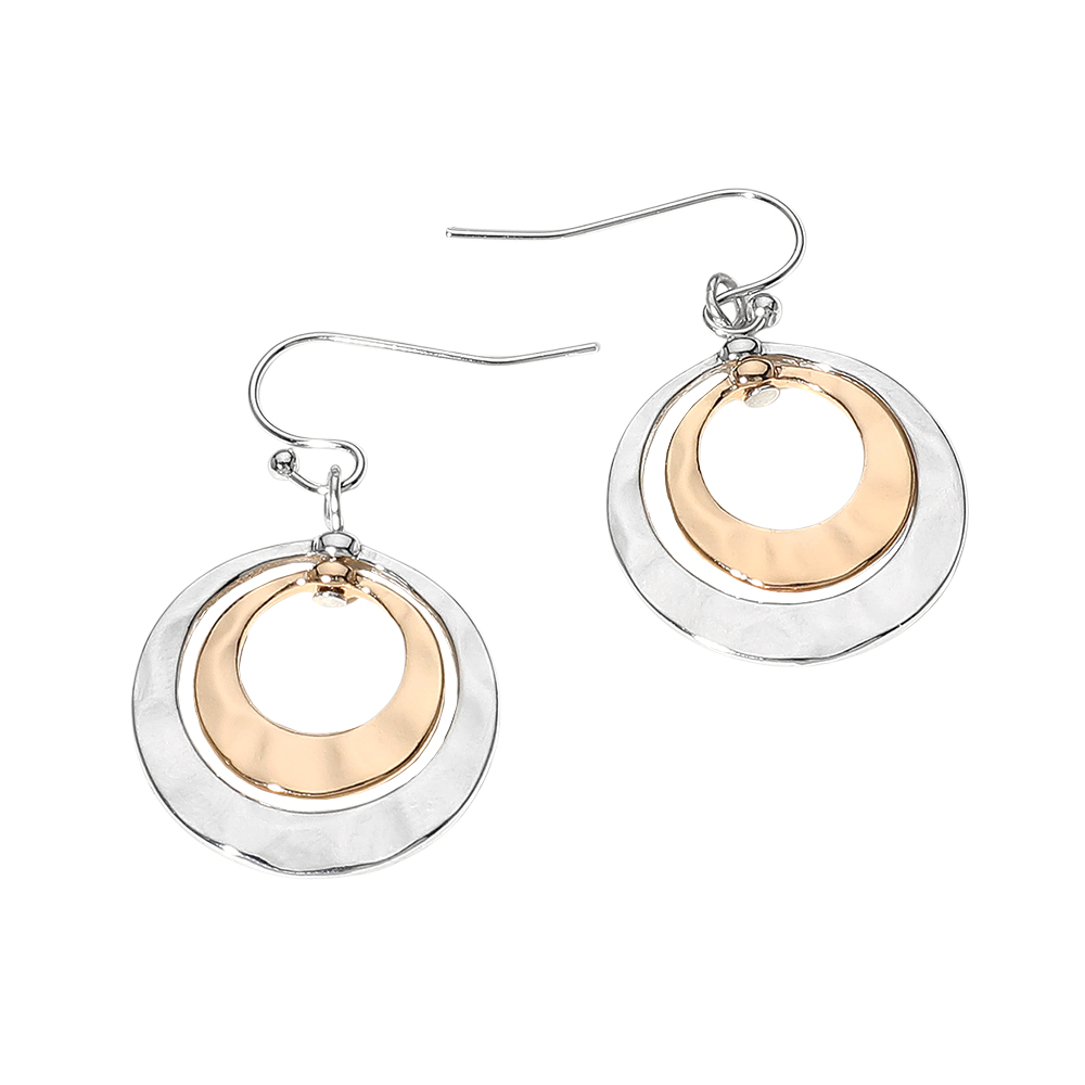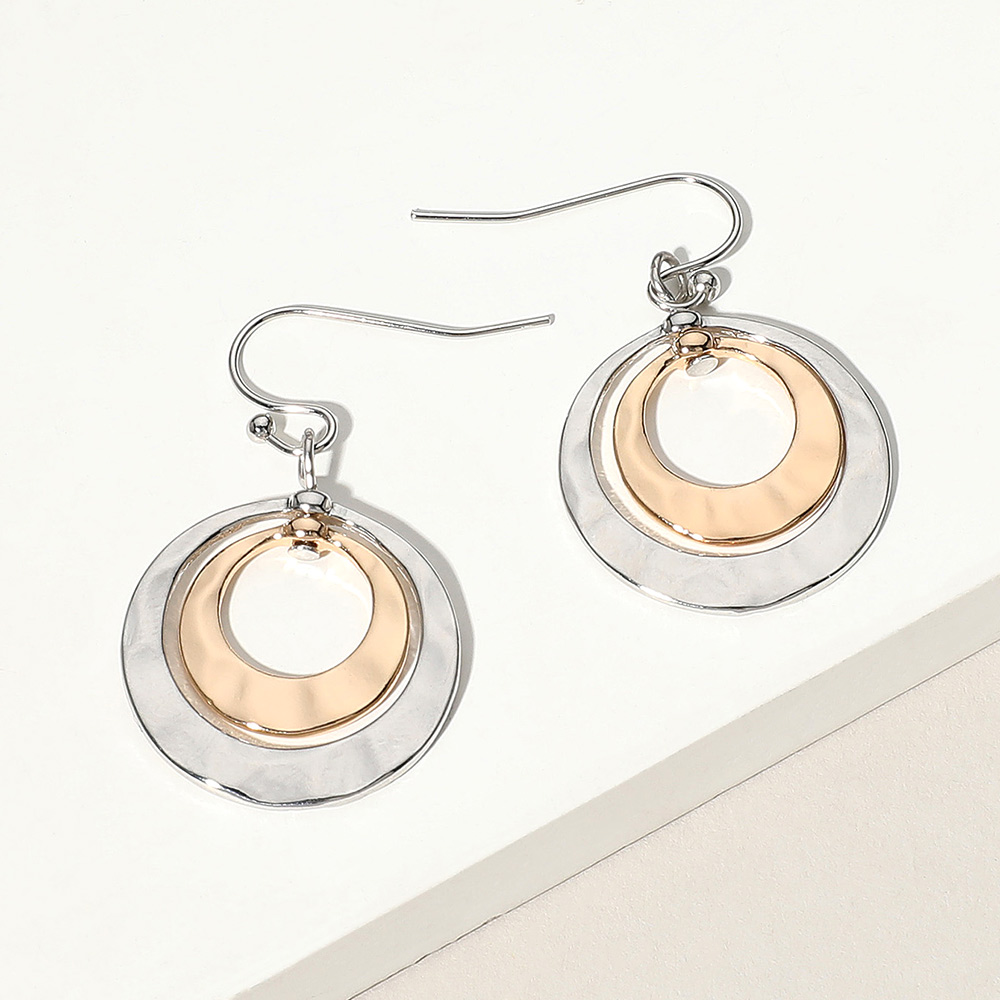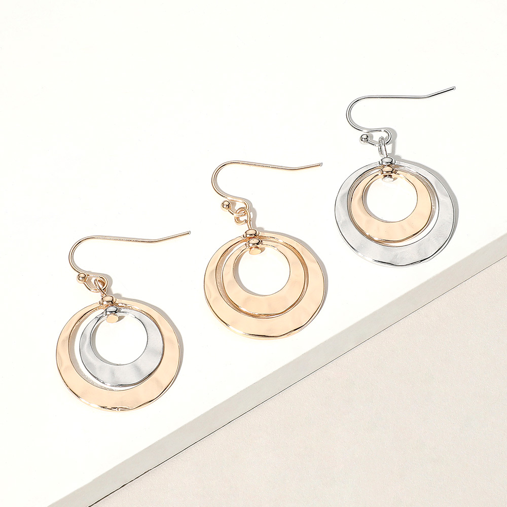 Hammered Metal Double Open Circle Layered Dangle Earrings